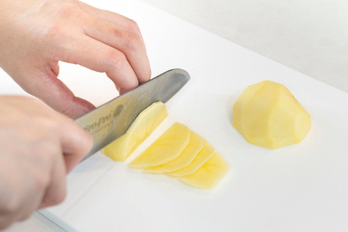 じゃがいもは皮をむき、半分に切ってから厚さ3mmくらいの薄切り(半月切り)にします。