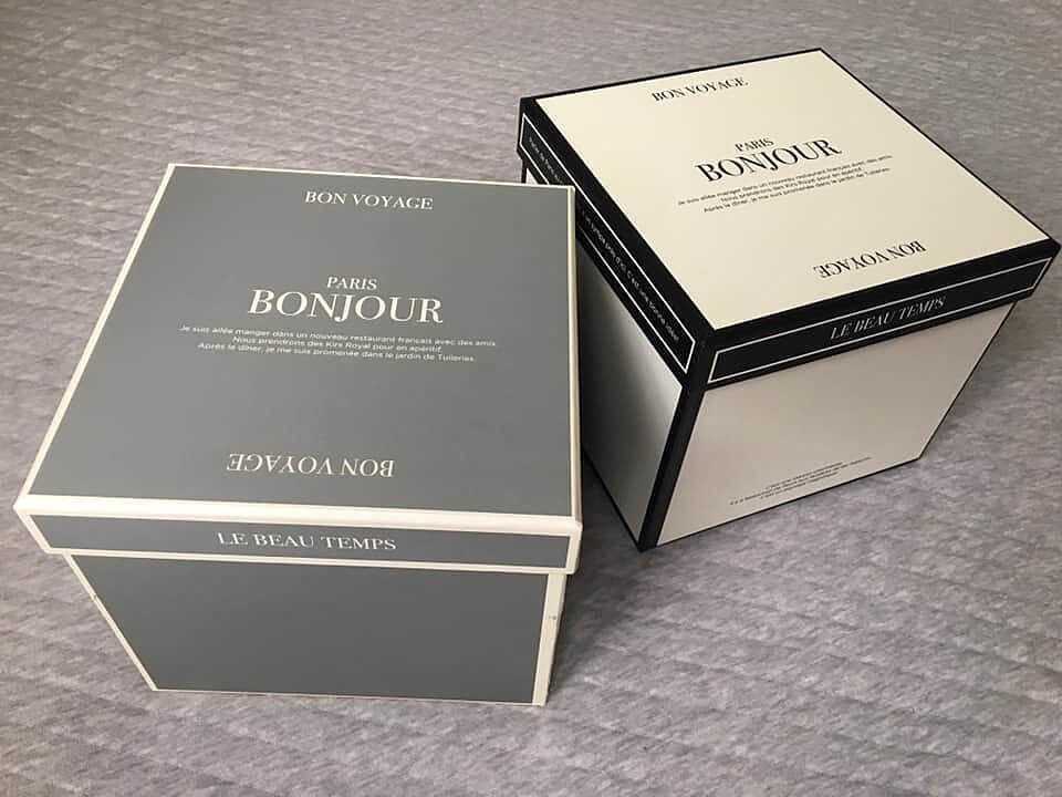 グレーとモノクロがクールでお洒落なギフトボックスといえば、パリ・ボンジュール。 色々なサイズがあるので、プレゼントの大きさによって使い分けができます。 こちらもシンプルなデザインなので、男性へのプレゼントにも最適です。