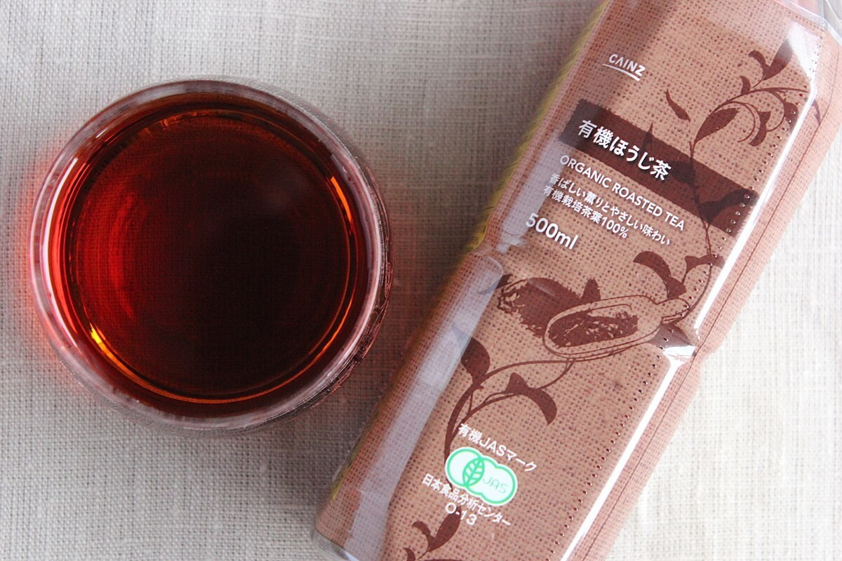 カインズの有機ほうじ茶は、鹿児島県産の有機食茶を使用し、じっくりと焙煎を行って香ばしい風味に仕上げられた、とのこと。