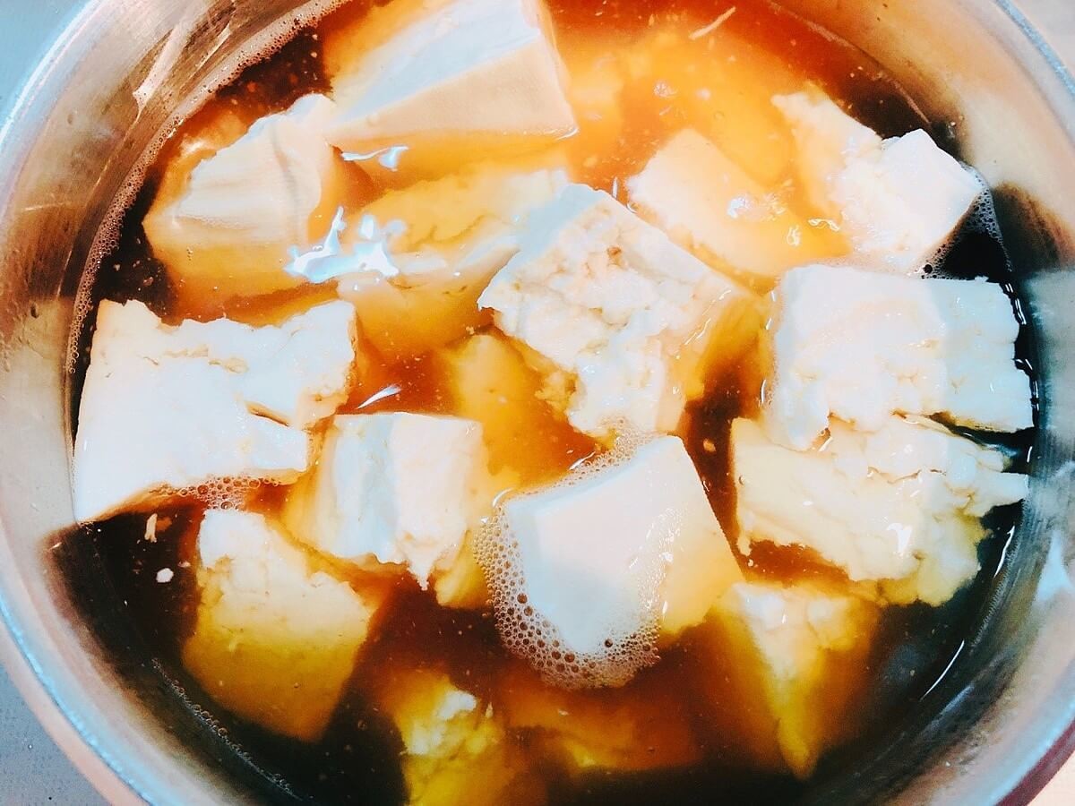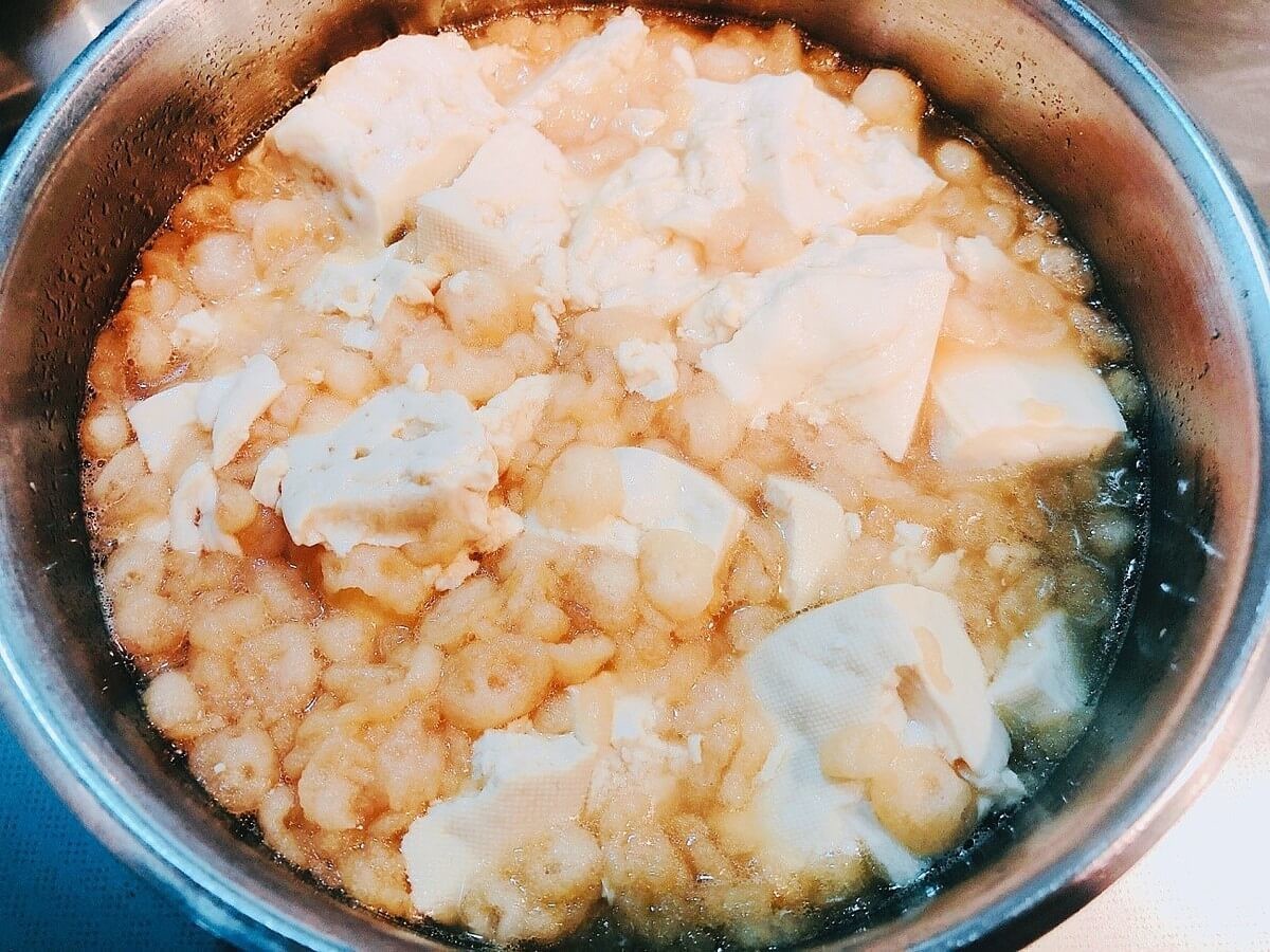 ② ①が沸騰したら、木綿豆腐を手でちぎりながら入れ10分くらい煮ます。
