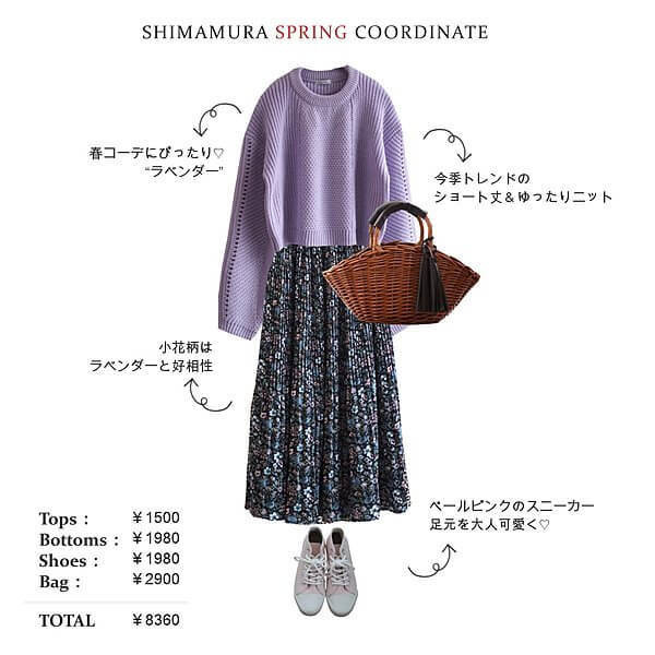 トップスは、トレンドカラーの“ラベンダー”のニットを。