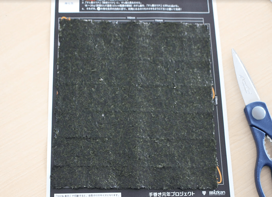 サイクロイド手巻き寿司シートの上に、全形(正方形)の海苔を置き、シートを海苔の大きさに合わせて切り離しておきます。