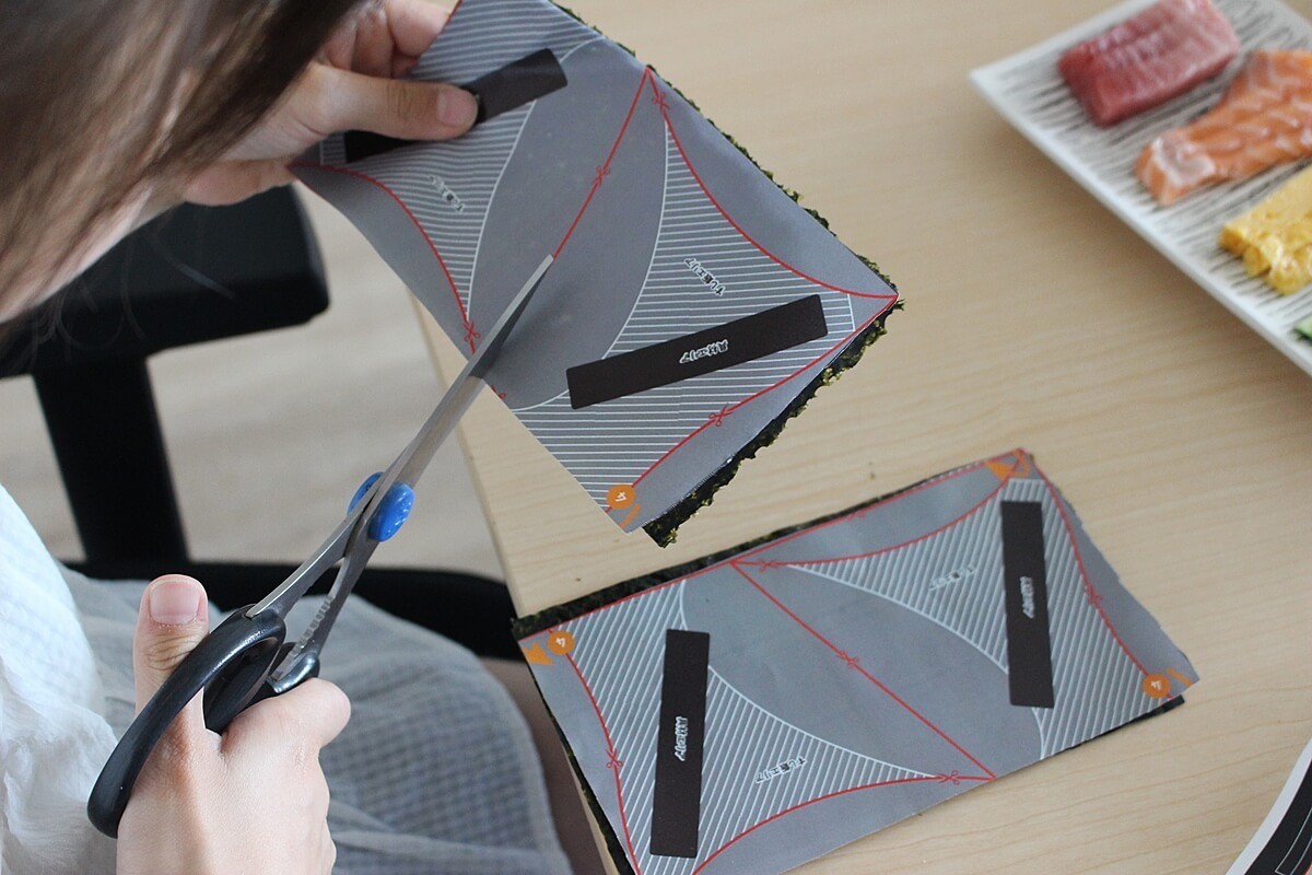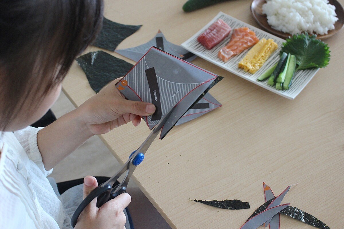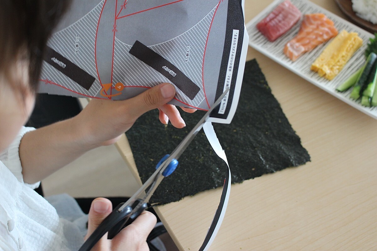 海苔が見えないと、海苔がズレたりきちんと海苔が切れているか分からなくて......。シートの上に海苔を乗せて、最初から海苔とシートを同じ大きさにしたら、きれいに切れました。(一花ちゃん)