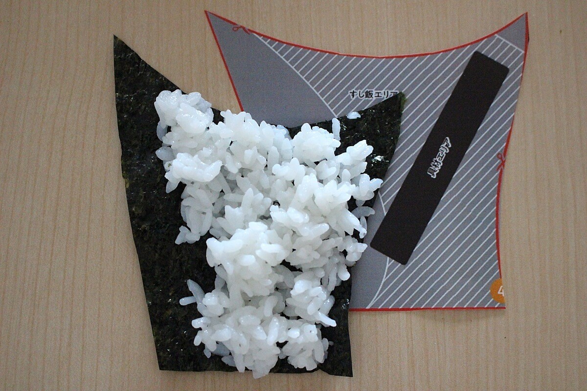 すし飯と具材をのせる場所は指定されていても、どれくらいの量をのせるとちょうどよいのかや、巻く角度がわからず、巻いてみるといびつな形に......。