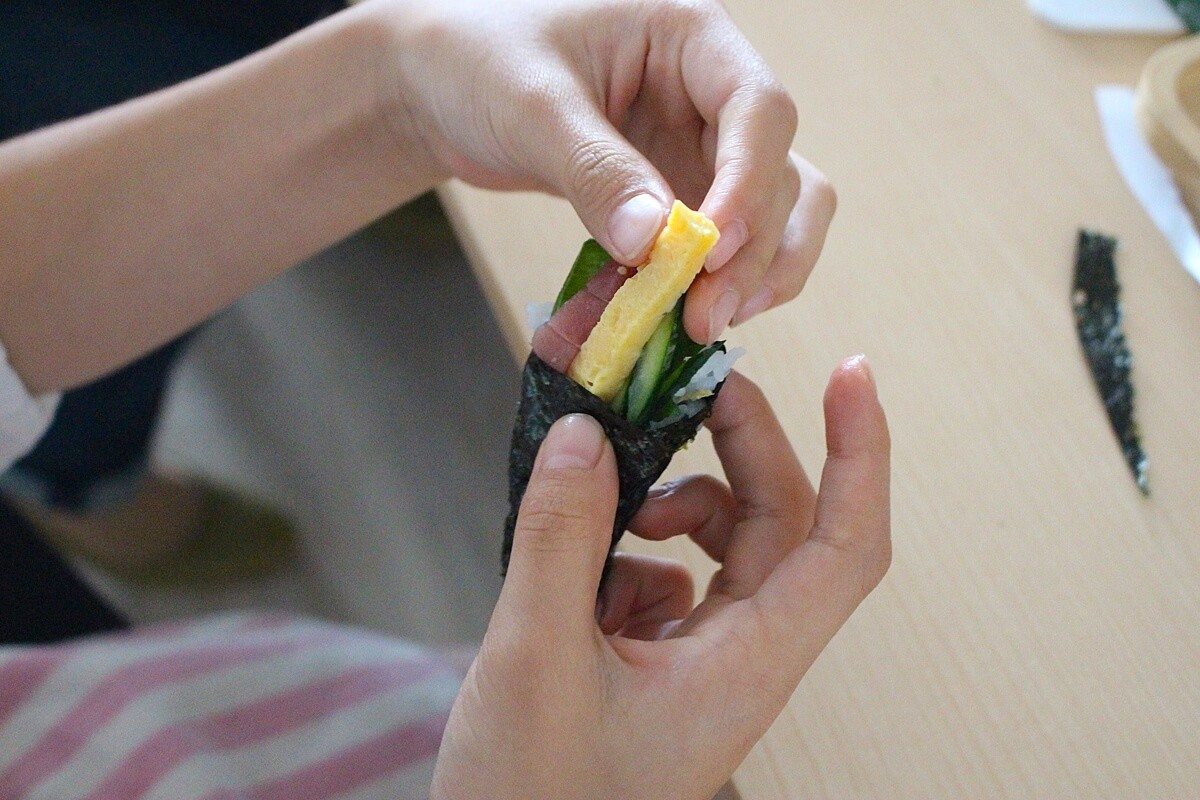 家で手巻き寿司を作るときは、向きや角度を考えながら巻いたことがなかったから、とっても新鮮で楽しかったです。最初は、仕上がりがどんな風になるのかイメージがわかなかったけれど、途中から、具の量や、彩りを考える余裕ができてきたよ。(一花ちゃん)