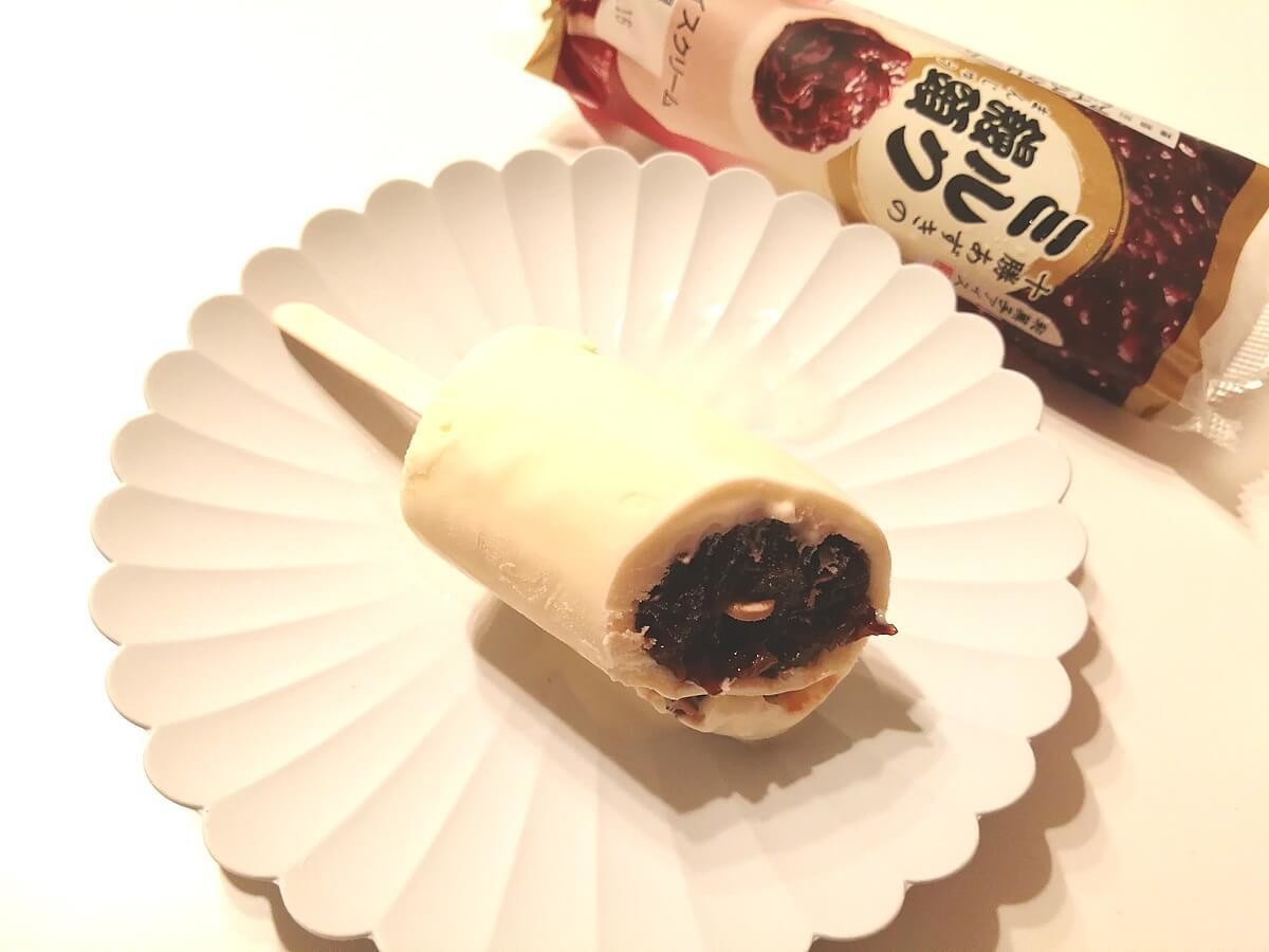 中心部にぎっしり粒あんが詰まっていてボリューミーです。周りのミルクアイスはやわらかめなので、すんなりカットできました。 食べてみると、ほどよい甘みのあんとミルクアイスが優しい味わい。あずきの皮が口に残るのでよく噛んで食べるアイスのようです。