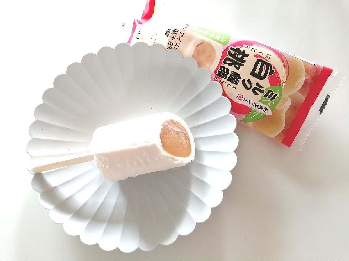まわりのミルクアイスは同じでさっぱりした甘さ。気になっていた白桃餡は思ったより餡子っぽいというか、白桃風味の白餡という感じです。なめらかな舌触りの白桃餡がねっとりとまわりのアイスと馴染んでマッチしています。