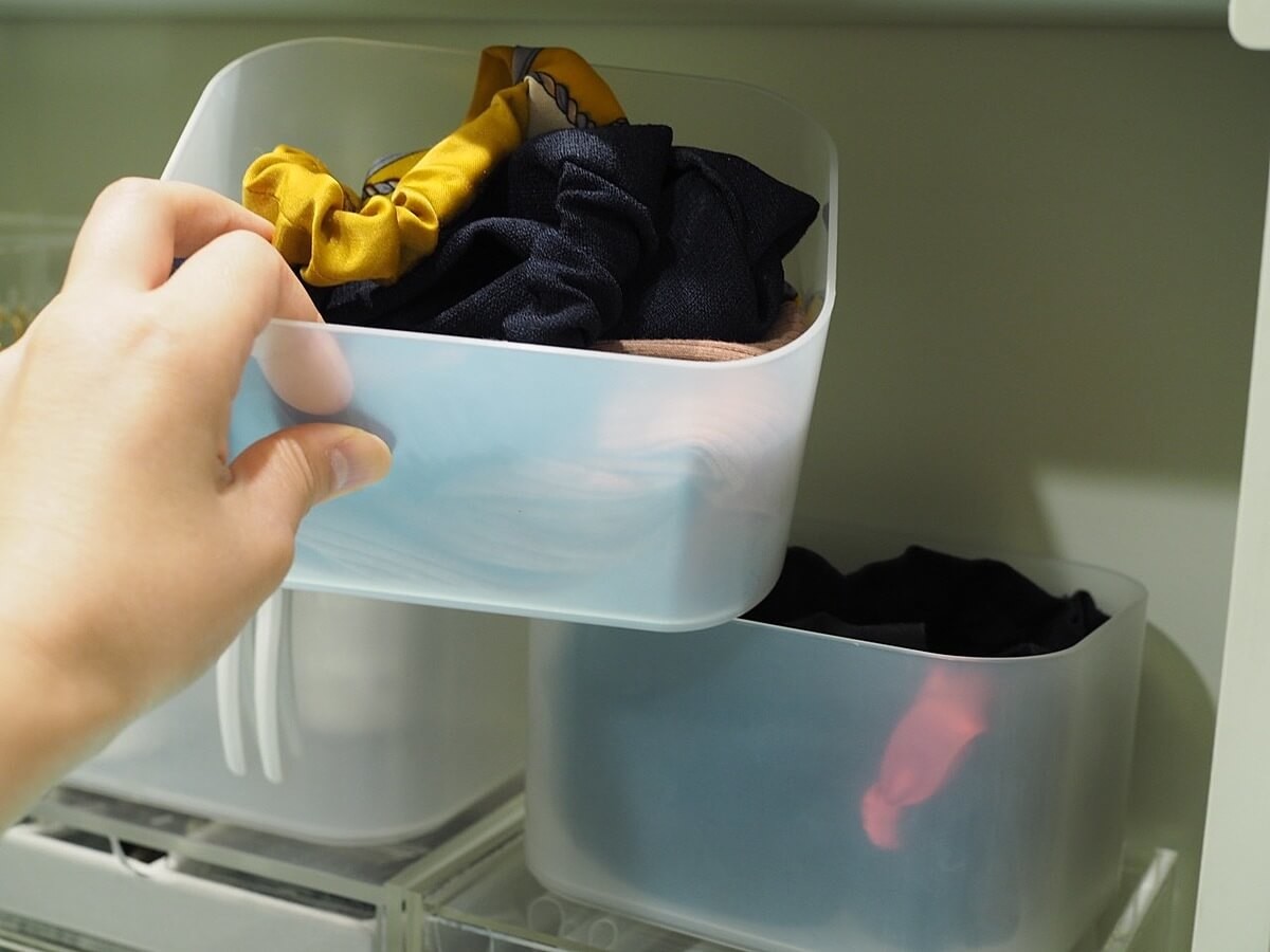 かさばるヘアアクセや大振りなバングルなどは、スタッキングできるケースに入れて二段に重ねて収納しています。