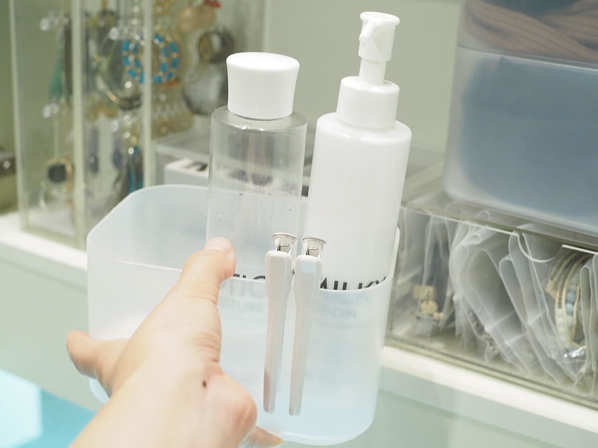 メイクの前のスキンケアに使うアイテムは、1つのケースにまとめてグルーピング。支度の時にケースごとサッと取り出せます。
