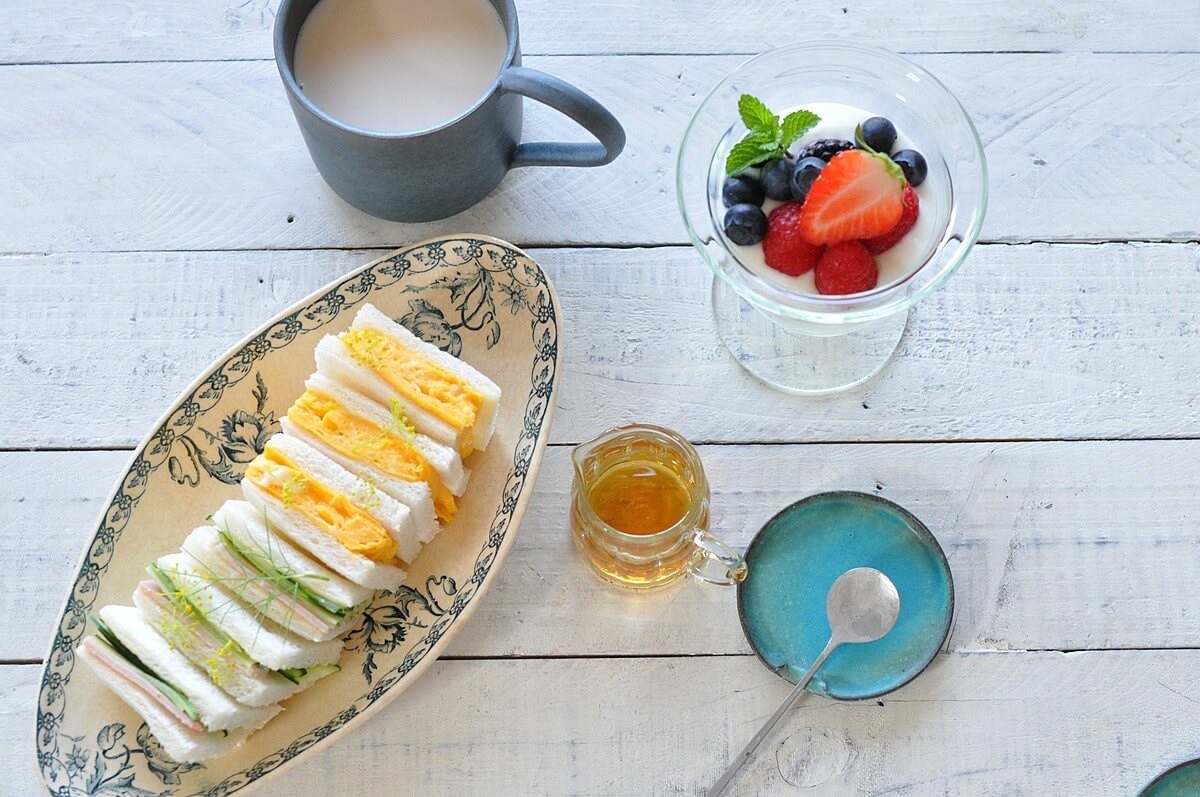 なんてことないサンドイッチの朝ごはんですが、 ヨーグルトをデザートカップに入れただけでテーブルが華やぎます。