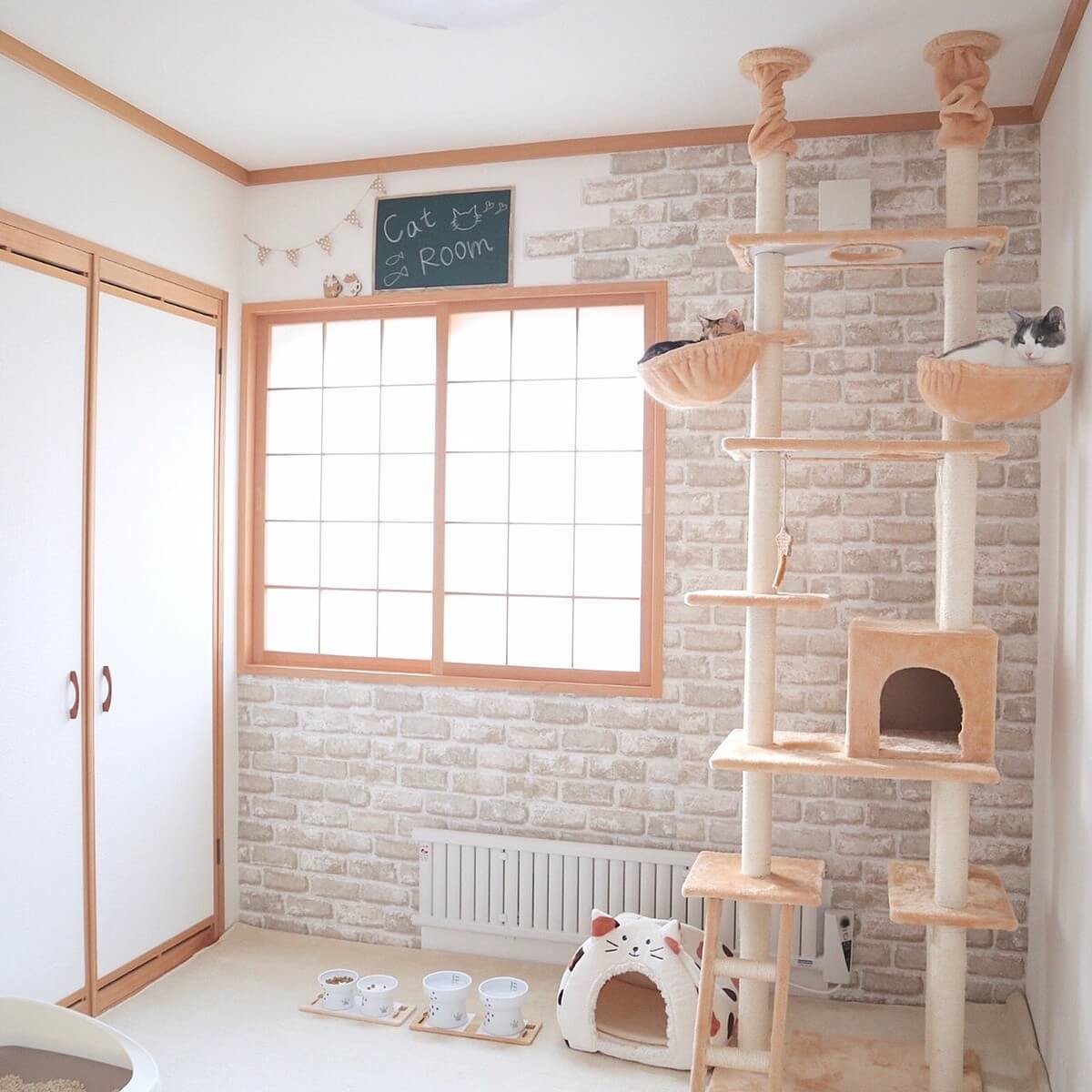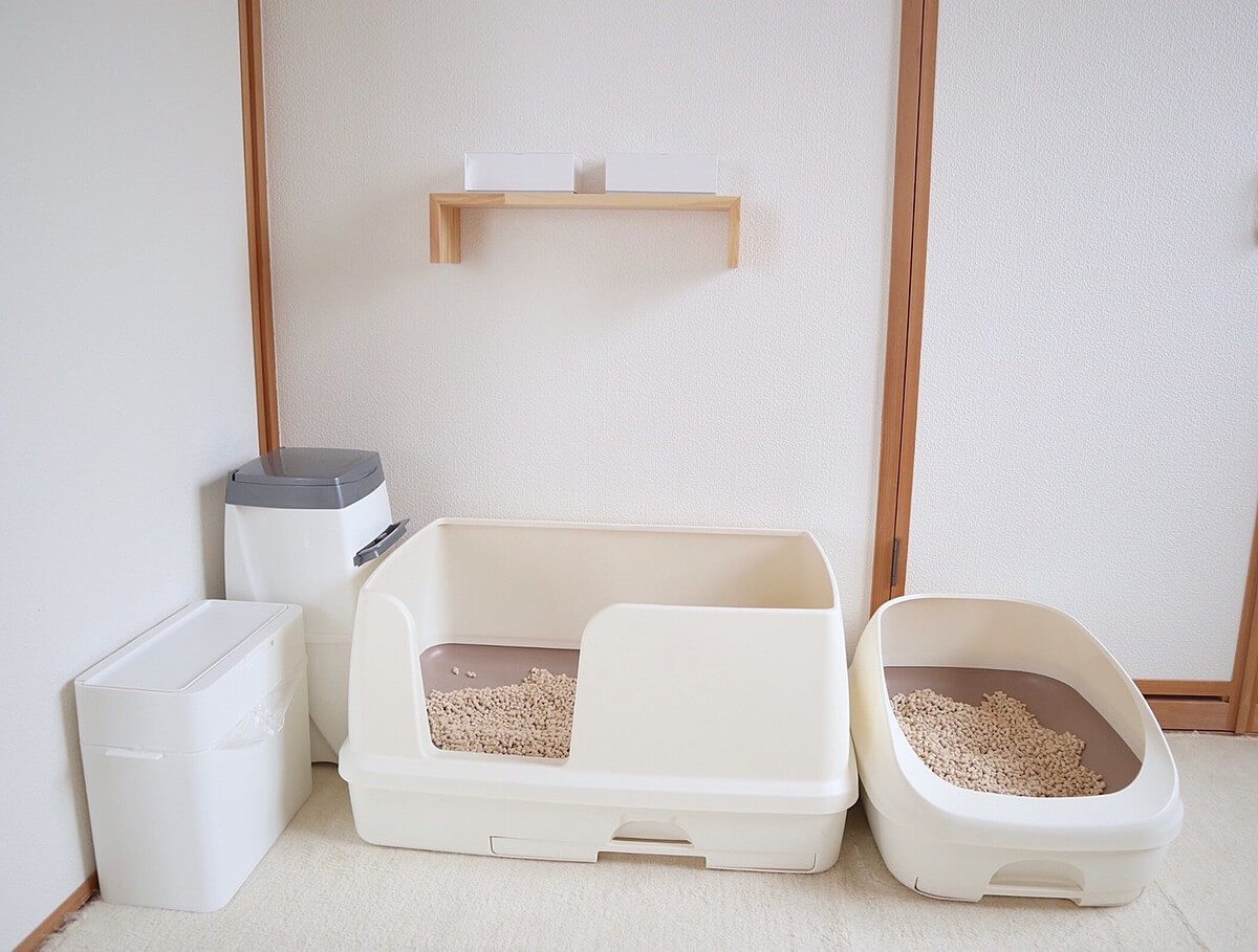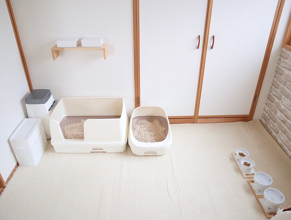 猫の大きなトイレの横にも省スペースで邪魔にならず、ナチュラルインテリアに統一している猫部屋。