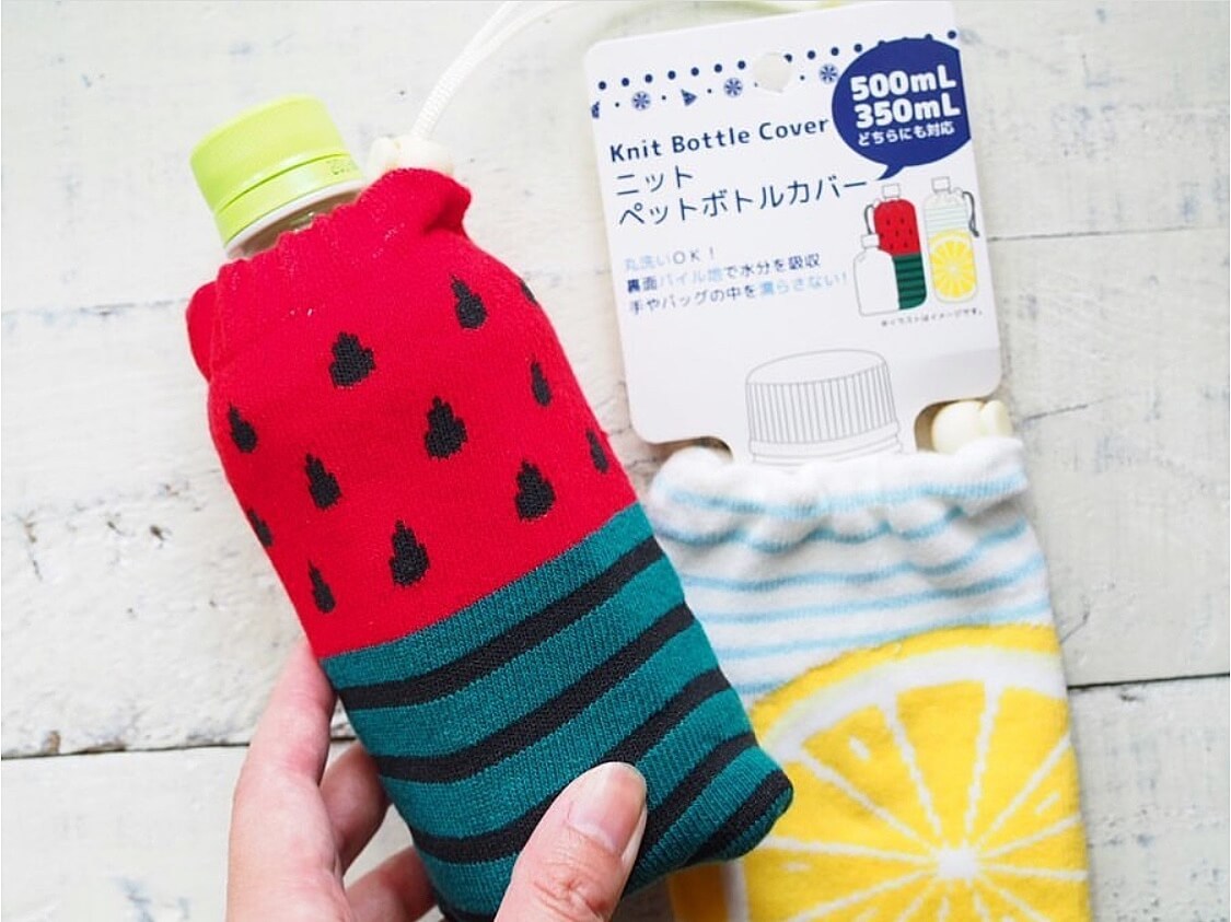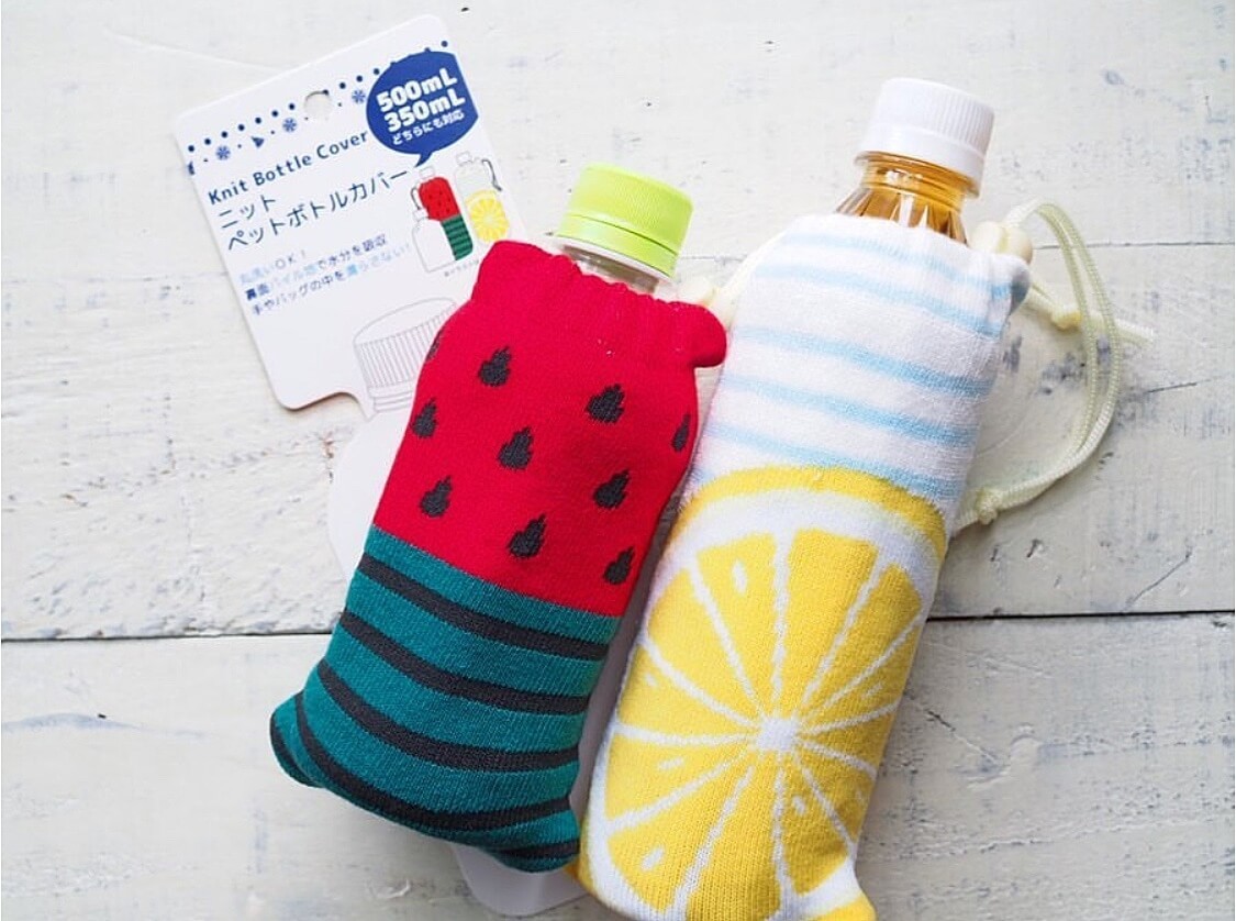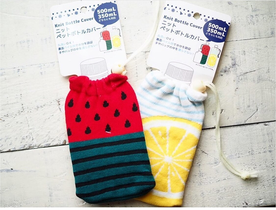 ▲セリア「ニットペットボトルカバー フルーツ柄 スイカ/レモン」各100円(税抜)