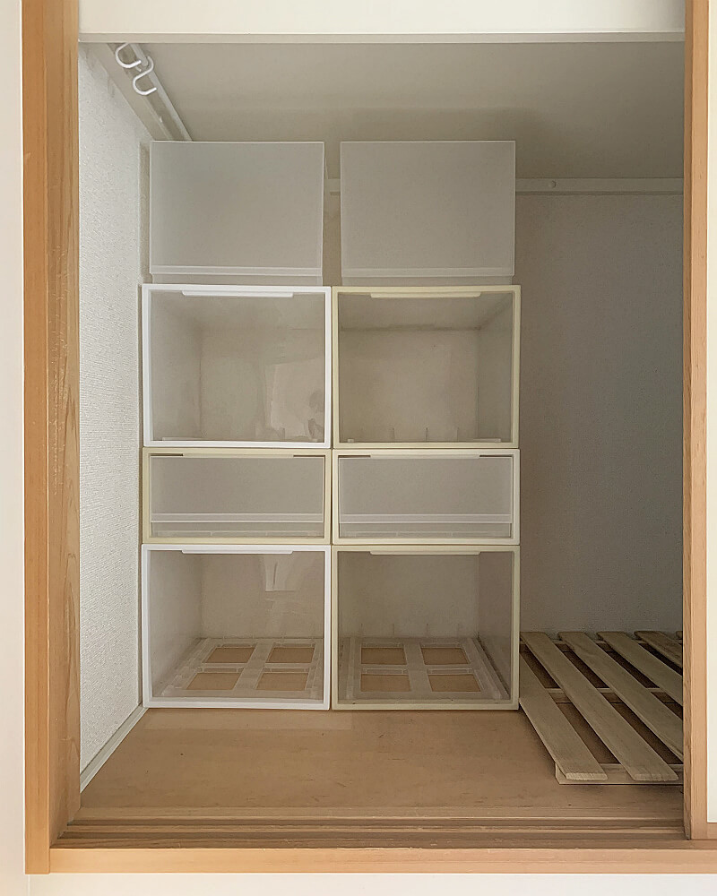 引き出しタイプの収納ボックスを縦に積み、1人分のロッカーを作ります。
