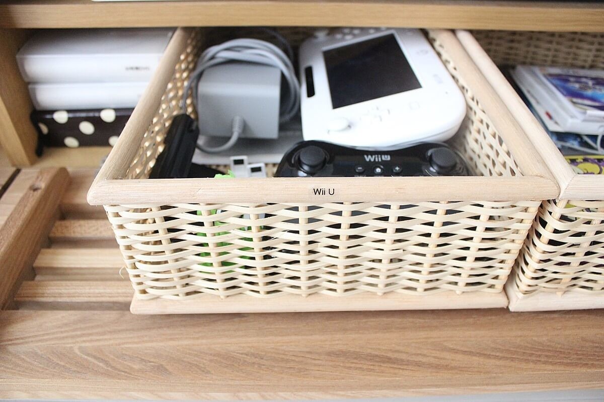 ゲーム機本体やコントローラーは大きさがあるので、ゲーム機の種類別にざっくりとカゴに分けて収納しています。 Nintendo Switch、Wii U、ニンテンドー3DSはそれぞれグループ分け。