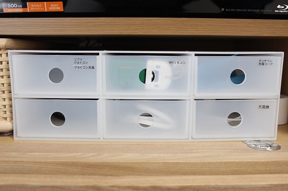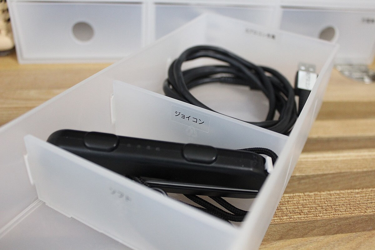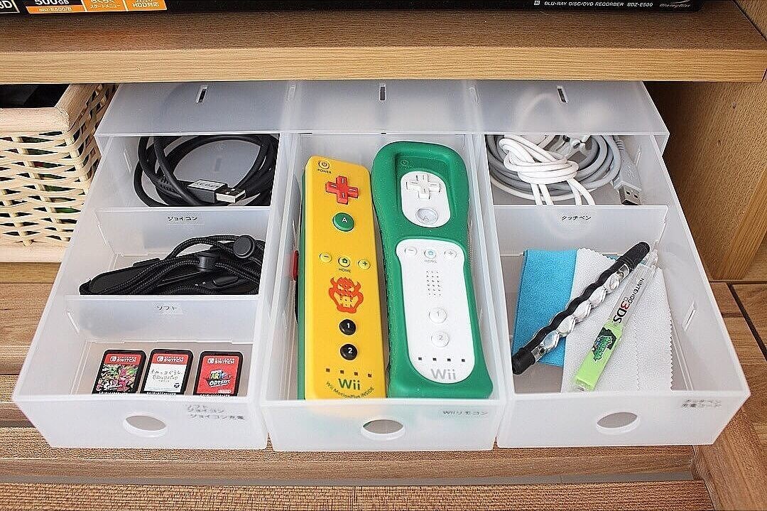 ゲーム機のコードやアクセサリー類って、数も多いし散らかりやすいですよね。我が家ではざっくり分ける方法と、細かく分ける方法で整理をし、収納しています。