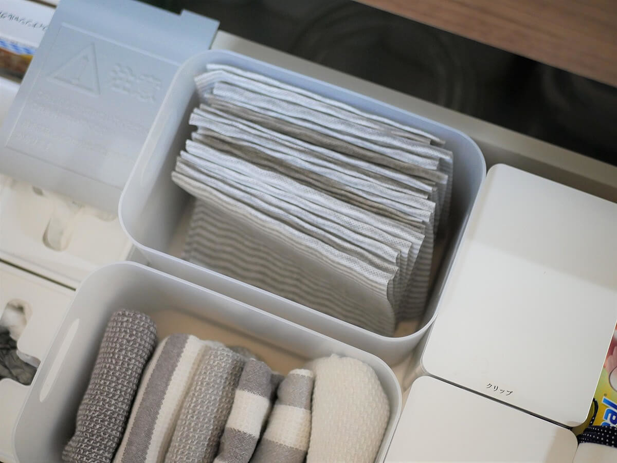 1枚が大きいので半分に切って使いやすくし収納。コスパもとても良いのでおすすめです。