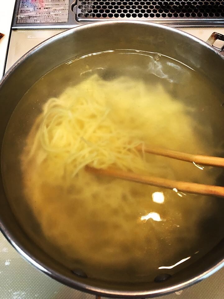 まずは、1玉につき1リットルのお湯で麺を湯がきます。