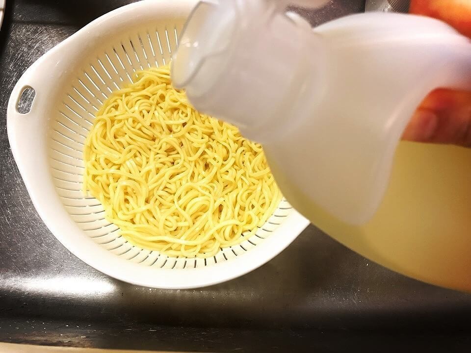 ゆでた麺をザルに開け、1玉につき大さじ1のサラダ油を回しかけ、麺に絡めます。