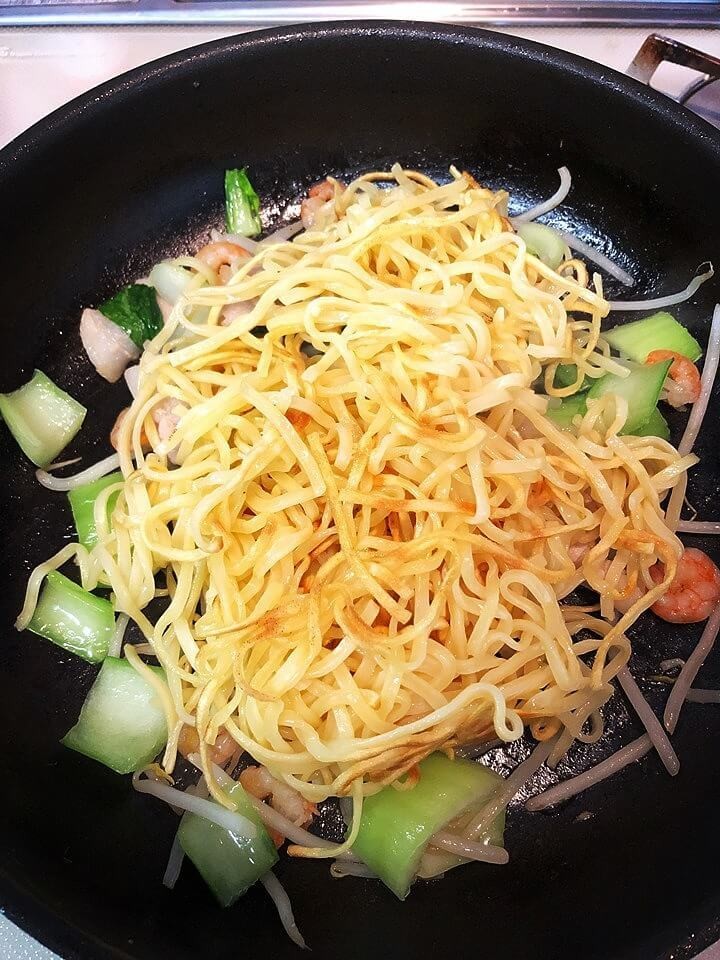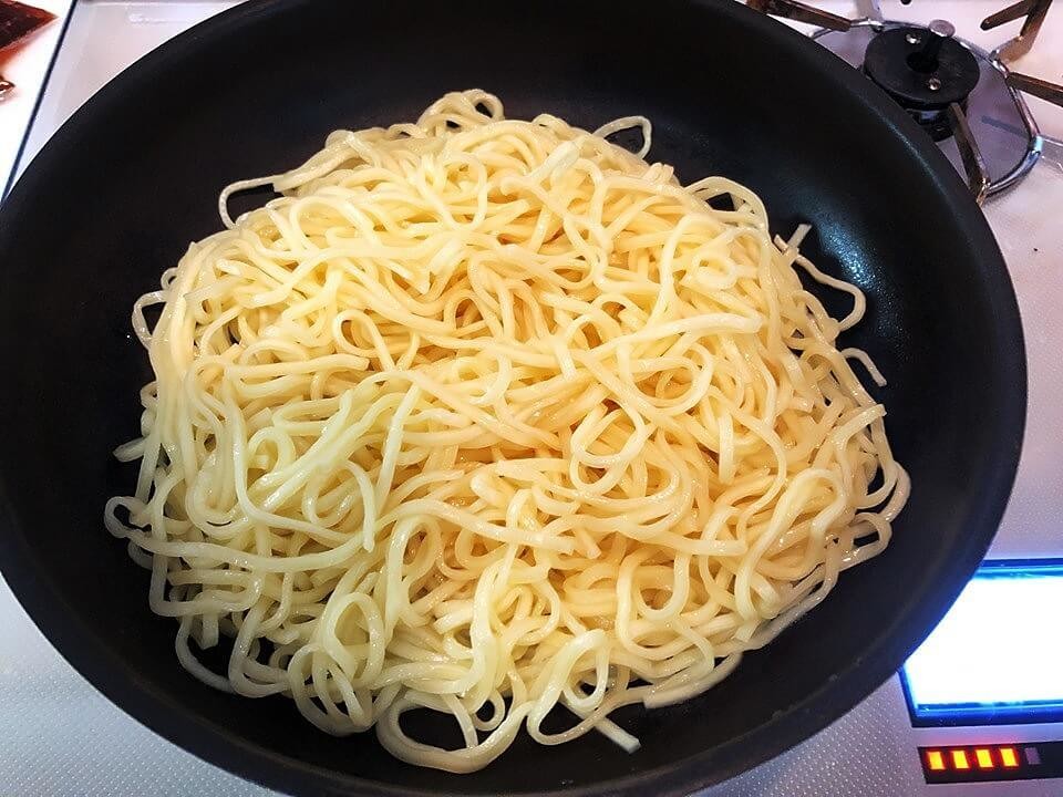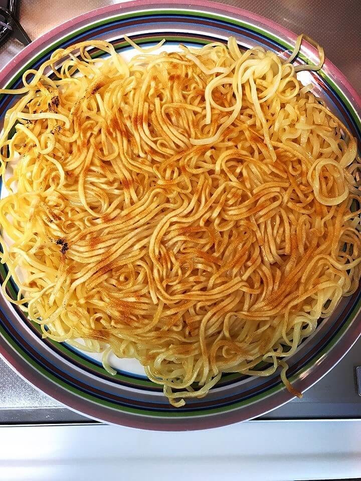 油を絡めた麺を、フライパンで両面こんがりと焼きます。