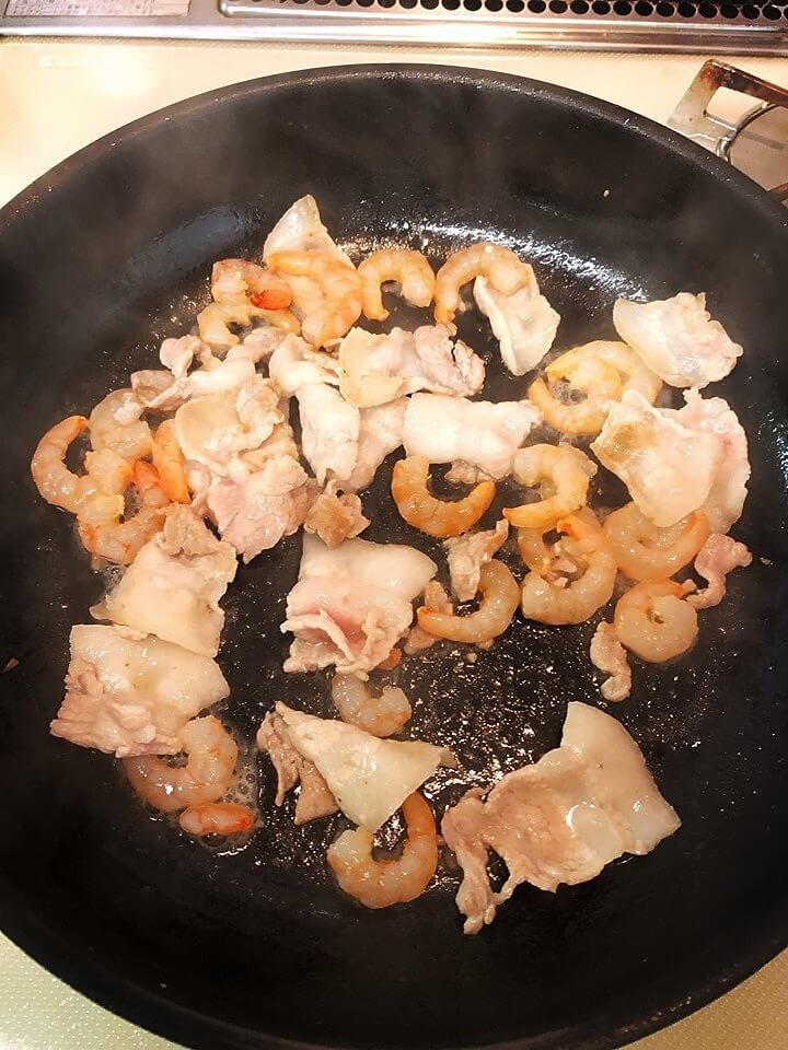 次に、同じフライパンで具材を炒めていきます。 豚肉とエビを色が変わるまで炒めます。