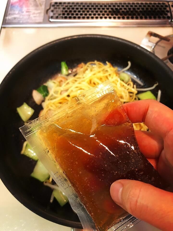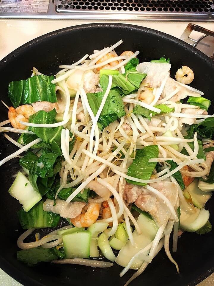 具材に火が通ったら、お皿に移していた麺を入れて、軽く混ぜます。