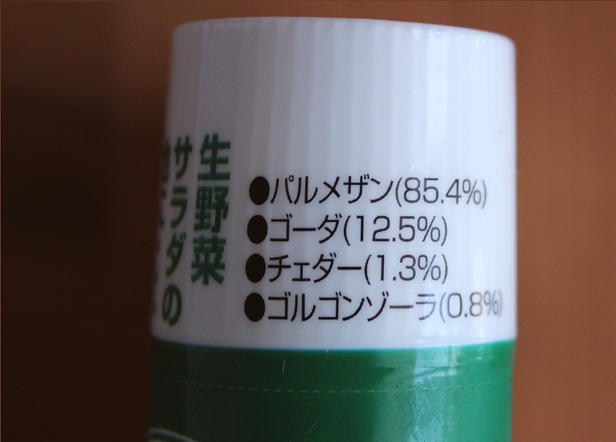 パルメザン(85.4%)、ゴーダ(12.5%)、チェダー(1.3%)、ゴルゴンゾーラ(0.8%)、4種類のチーズが入っています。