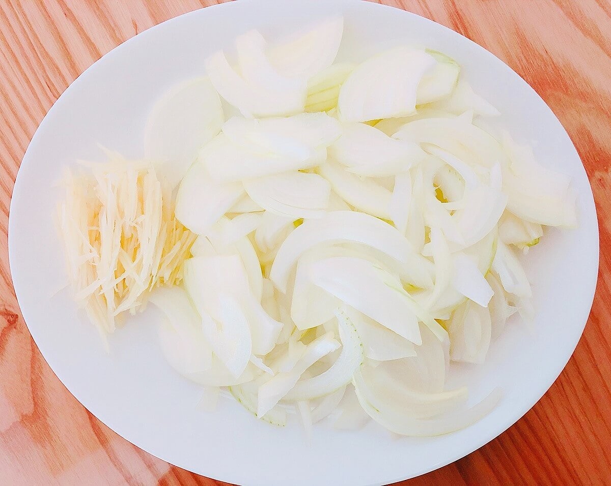 ① 豚肉は場合によっては食べやすい大きさに、玉ねぎは半分に切って薄くスライス、生姜は細い千切りにしておきます。