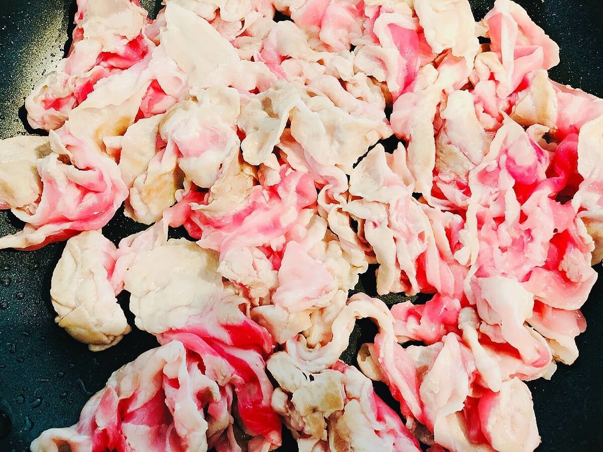② 油を入れたフライパンが温まったら豚肉を入れて炒めます。