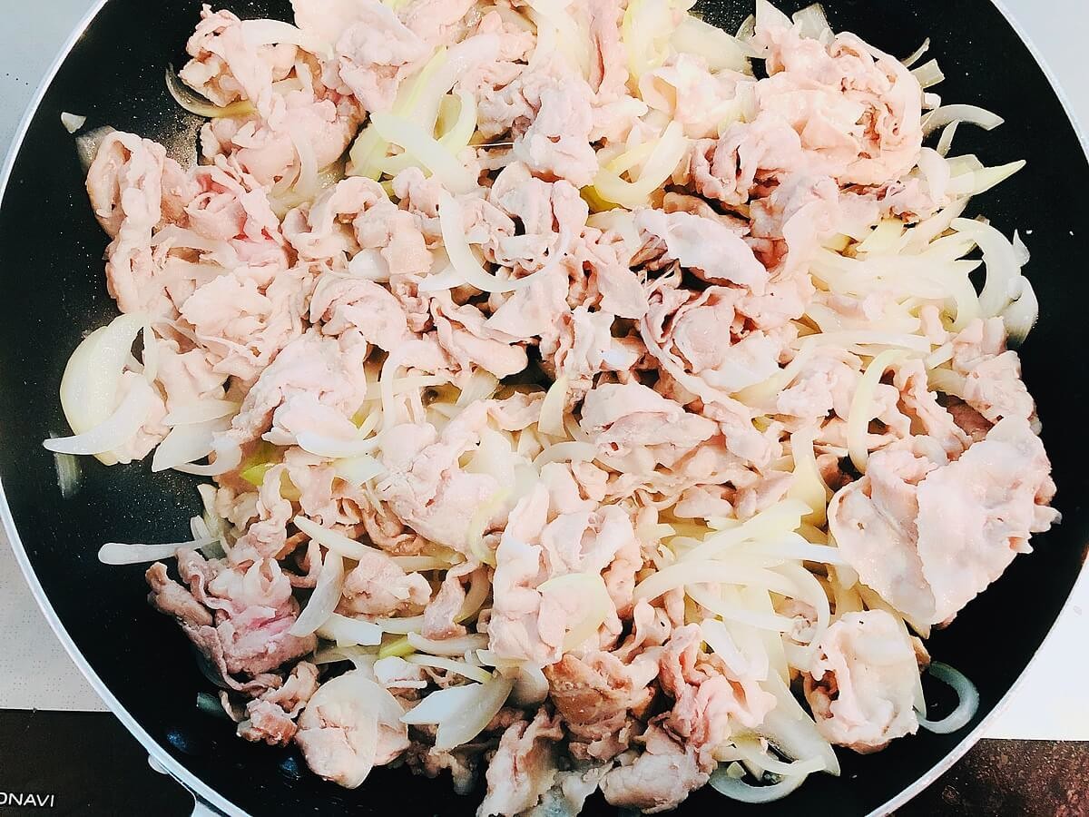 ③ 豚肉が半分くらい炒まったら玉ねぎを入れてさらに炒めます。