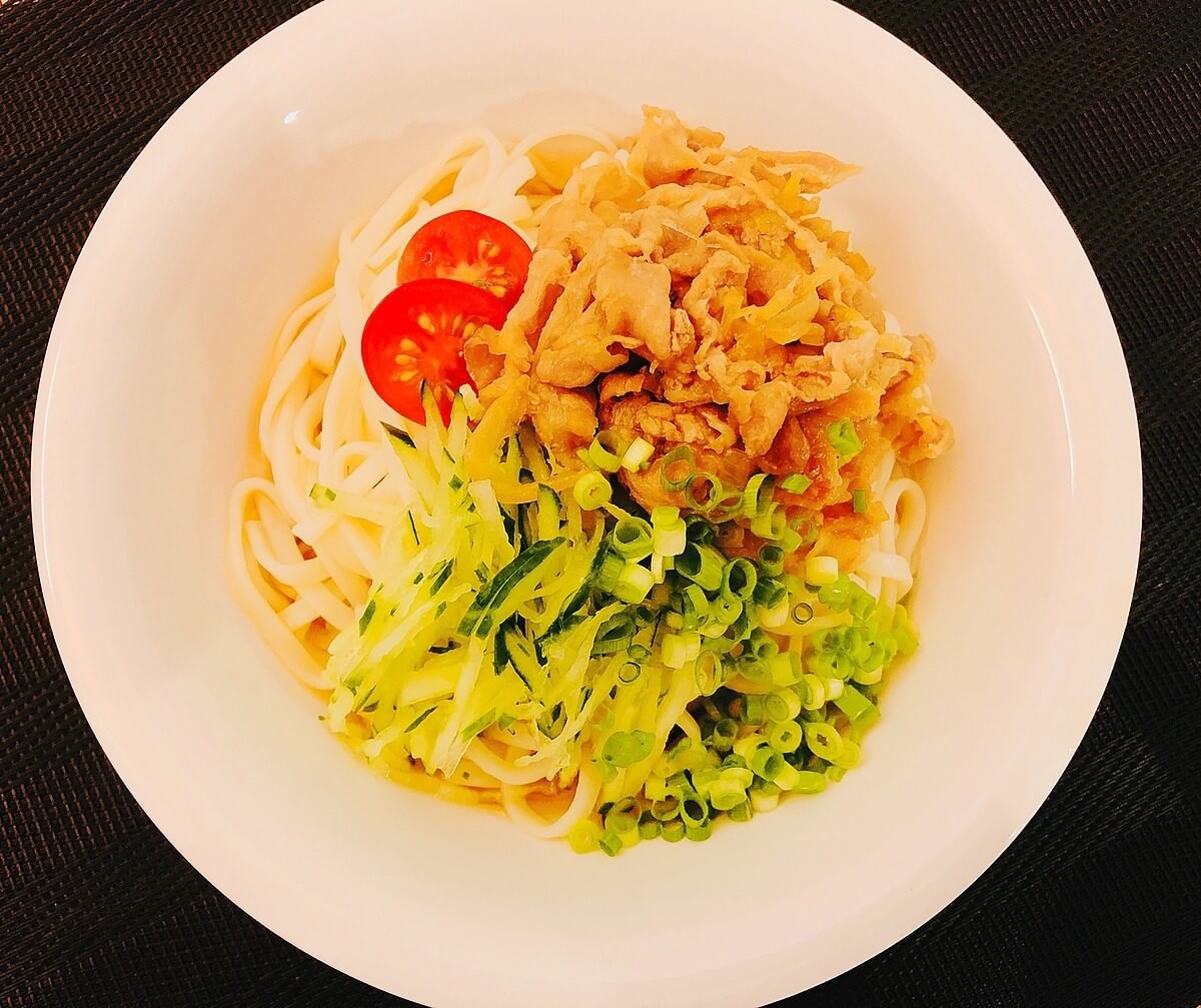 ③ うどんの水気をしっかり切り、上に豚肉と生姜の炒め煮・きゅうり・ミニトマト・葱をのせ、麺つゆをかけて完成です。