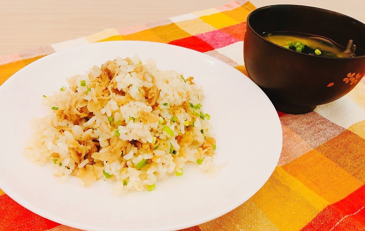 ② ごはんがバラバラになったら豚肉と生姜の炒め煮を入れてさらに炒め、最後に葱と醤油を加えて軽く炒めたら完成です。
