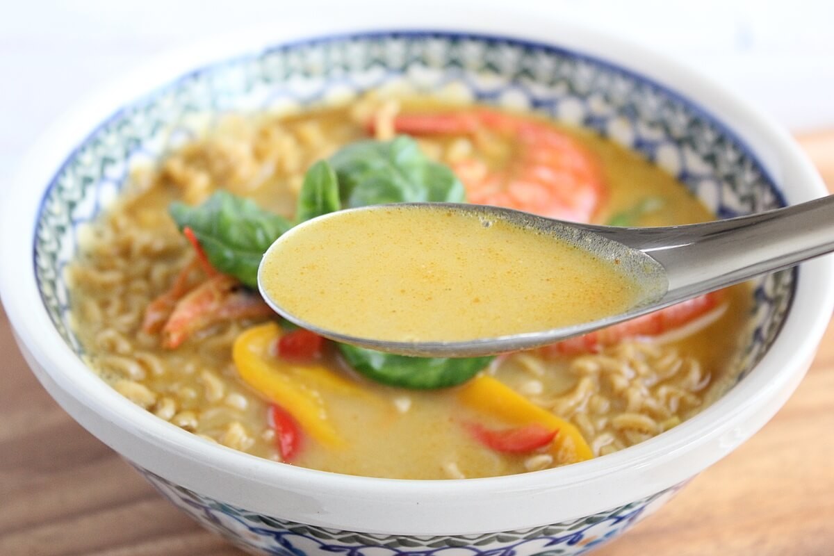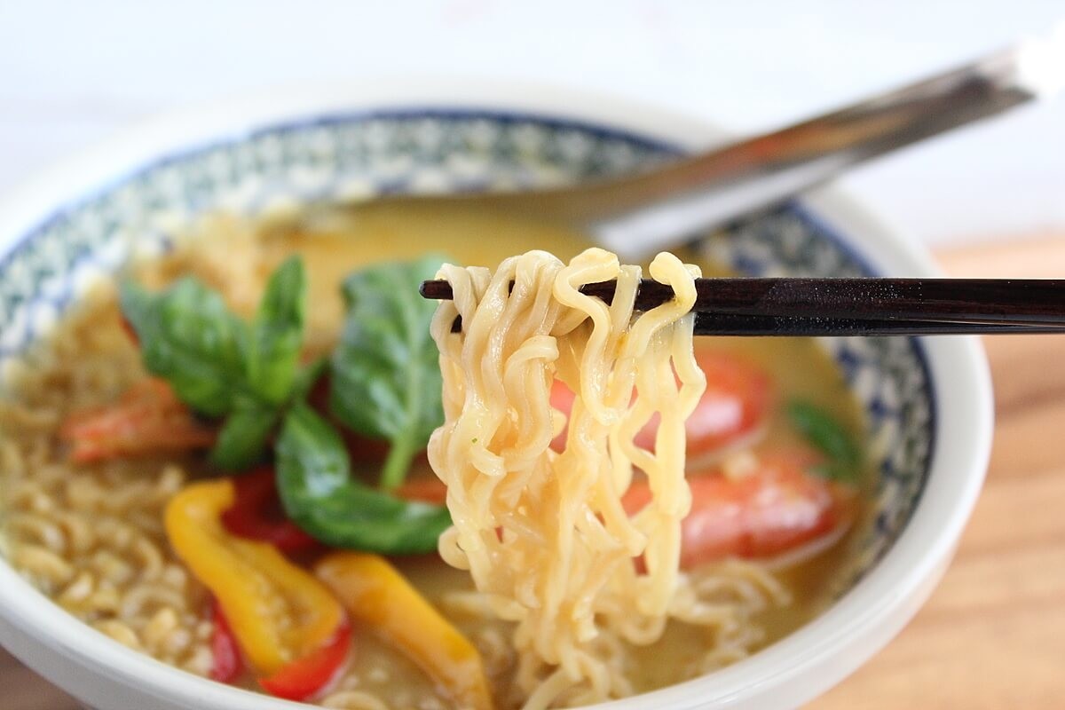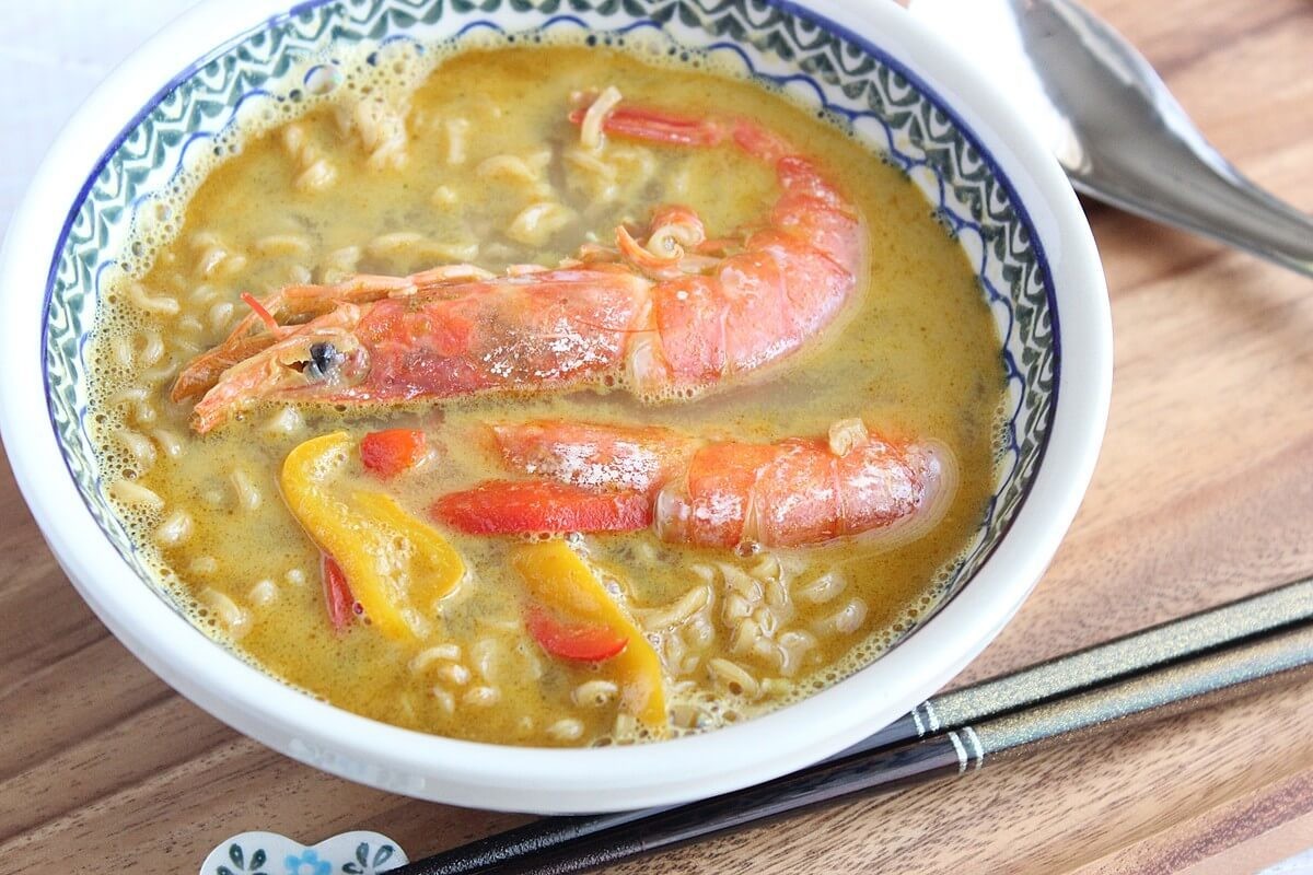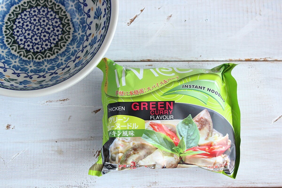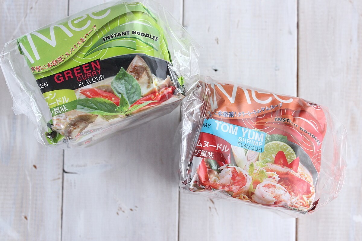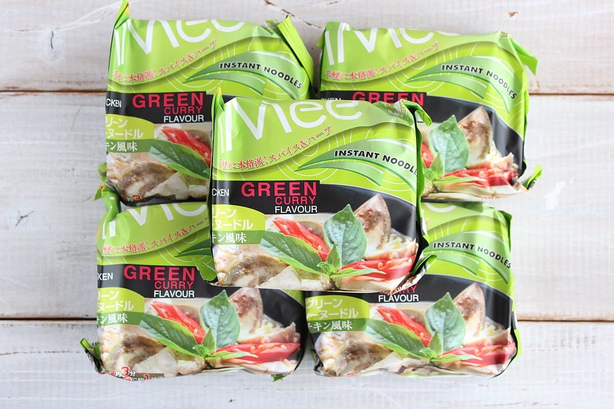 業務スーパーで購入できるインスタントラーメン、グリーンカレー味(チキン)とトムヤム味(エビ)をご紹介です。