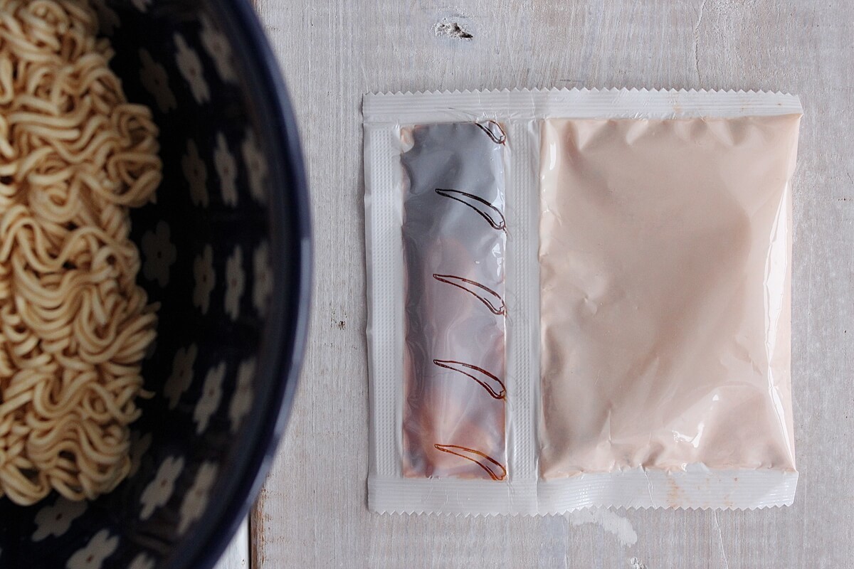 袋を開けると、揚げ麺と、粉とペースト状の調味料が入っています。