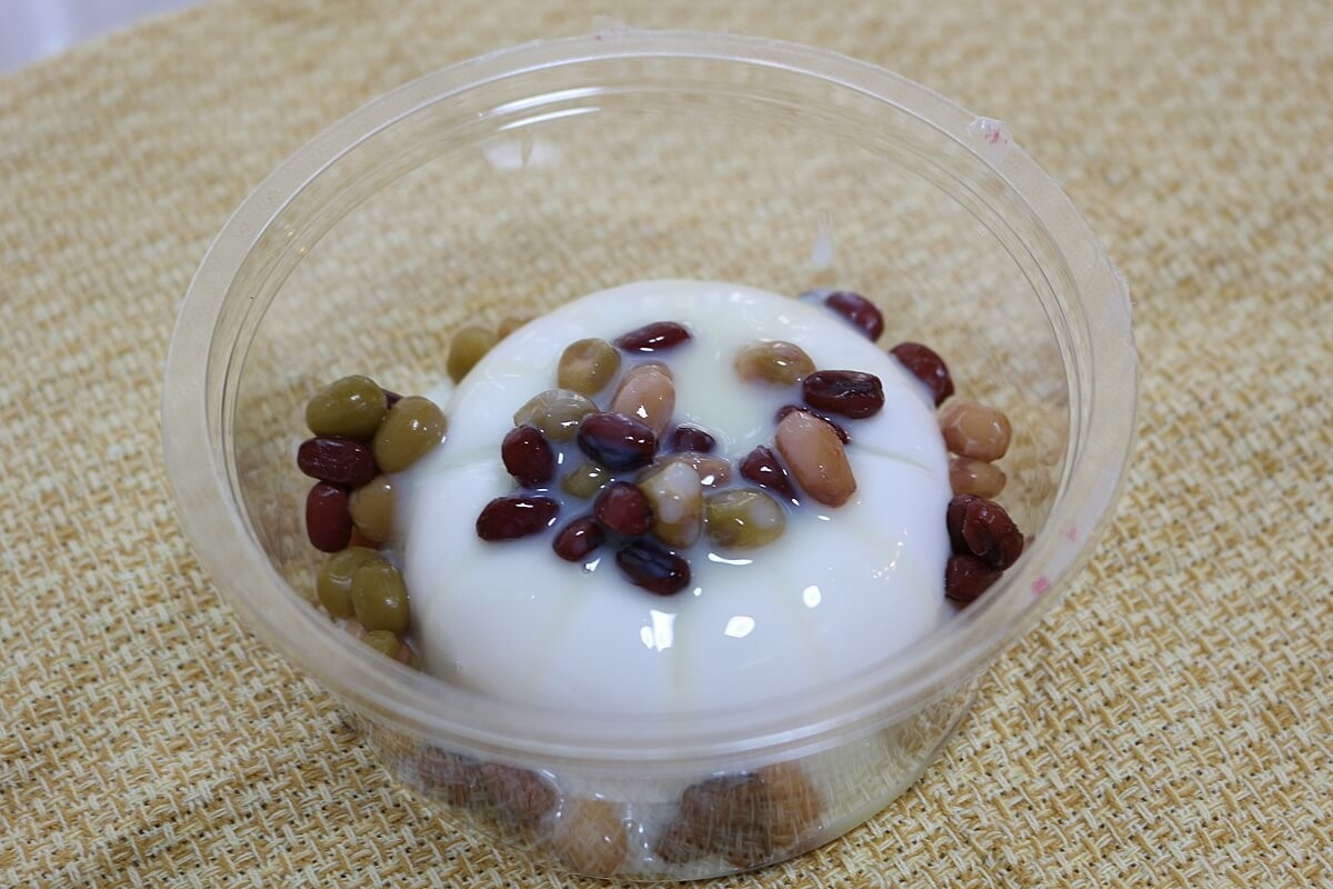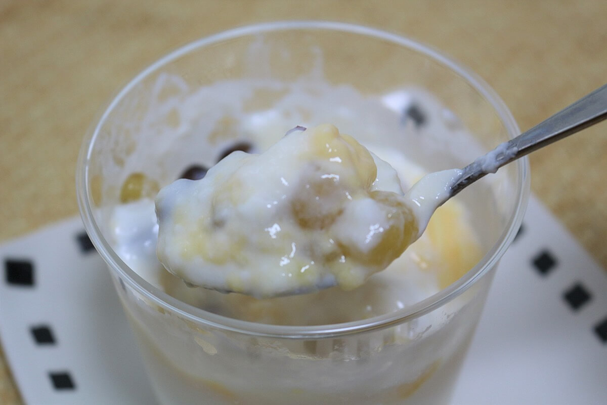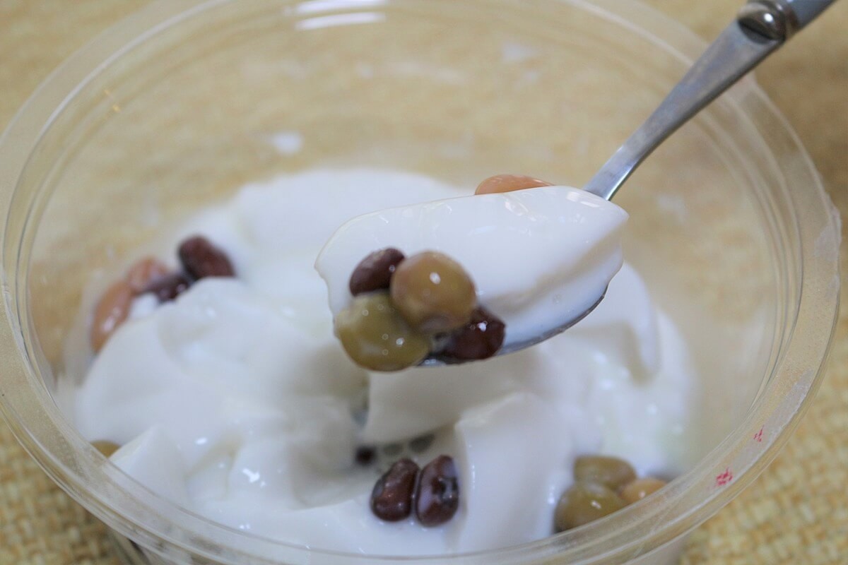 ココナッツプリンの量(145g)が豆や練乳よりも圧倒的に多いのですが、3色豆をイイ感じでモーモーチャーチャーすると、お豆の食感が楽しめます。