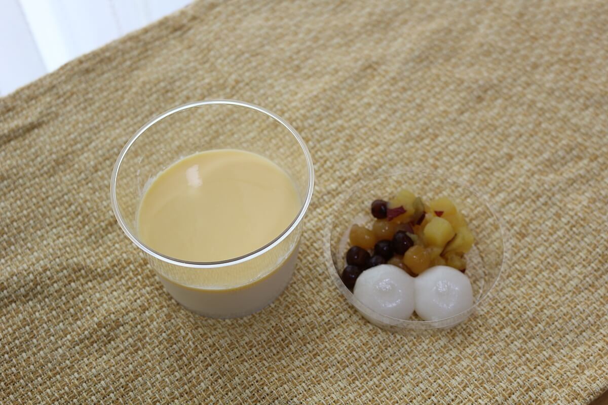 成城石井「モーモーチャーチャー」はセパレートタイプで、さつまいも、豆、餅という和の具材を、ココナツブランマンジェにお好みの量でモーモーチャーチャーします。