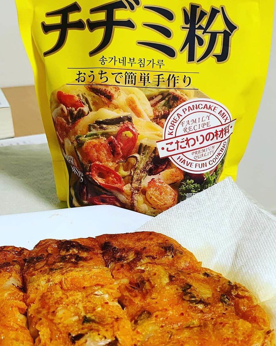 チヂミ粉に水を混ぜるだけで生地が簡単にできるんです。具材はお家にある野菜やシーフードなど好みでOK!