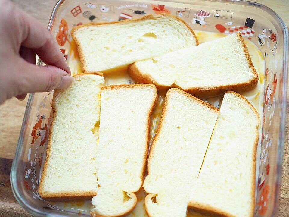 牛乳100ml、卵1個、砂糖大さじ1、バニラエッセンス少々(なくてもOK)を混ぜた卵液に、食パンをひたします。