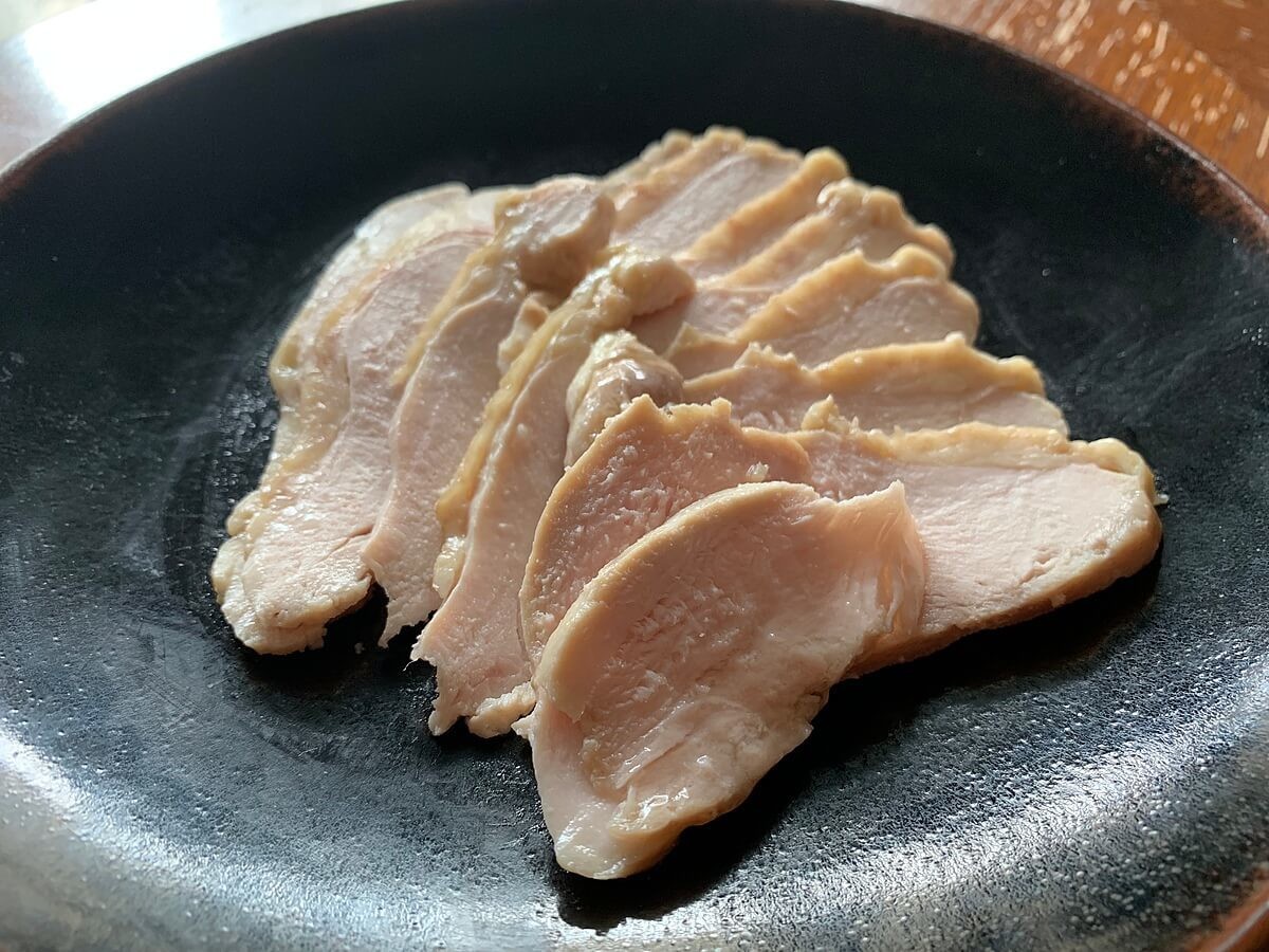 しっかり味がしみ込んだスモークチキン風の蒸し鶏ができました。