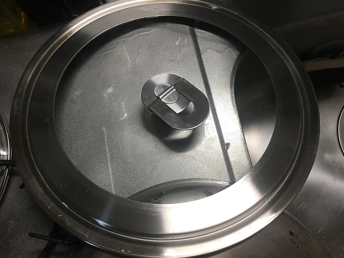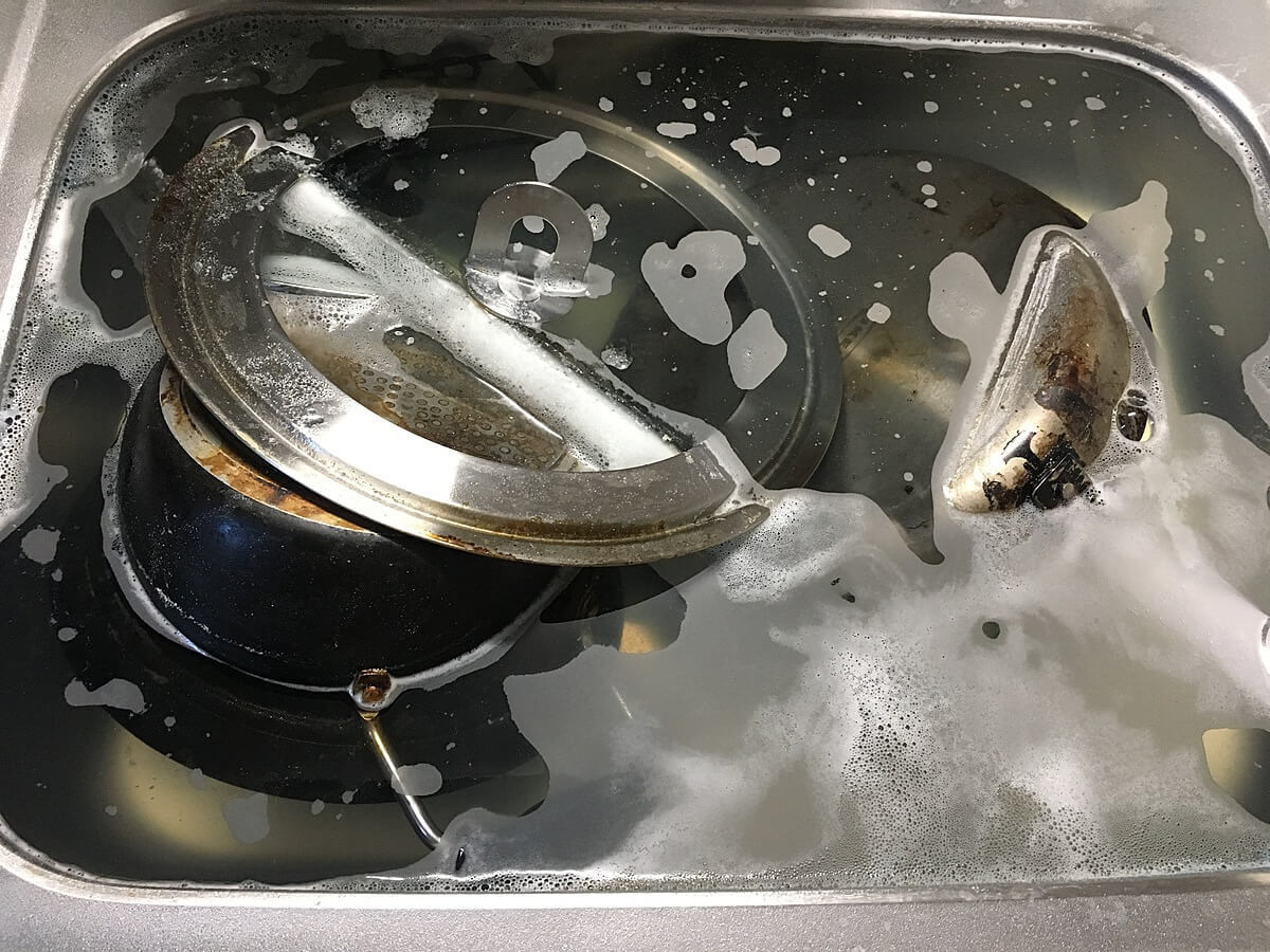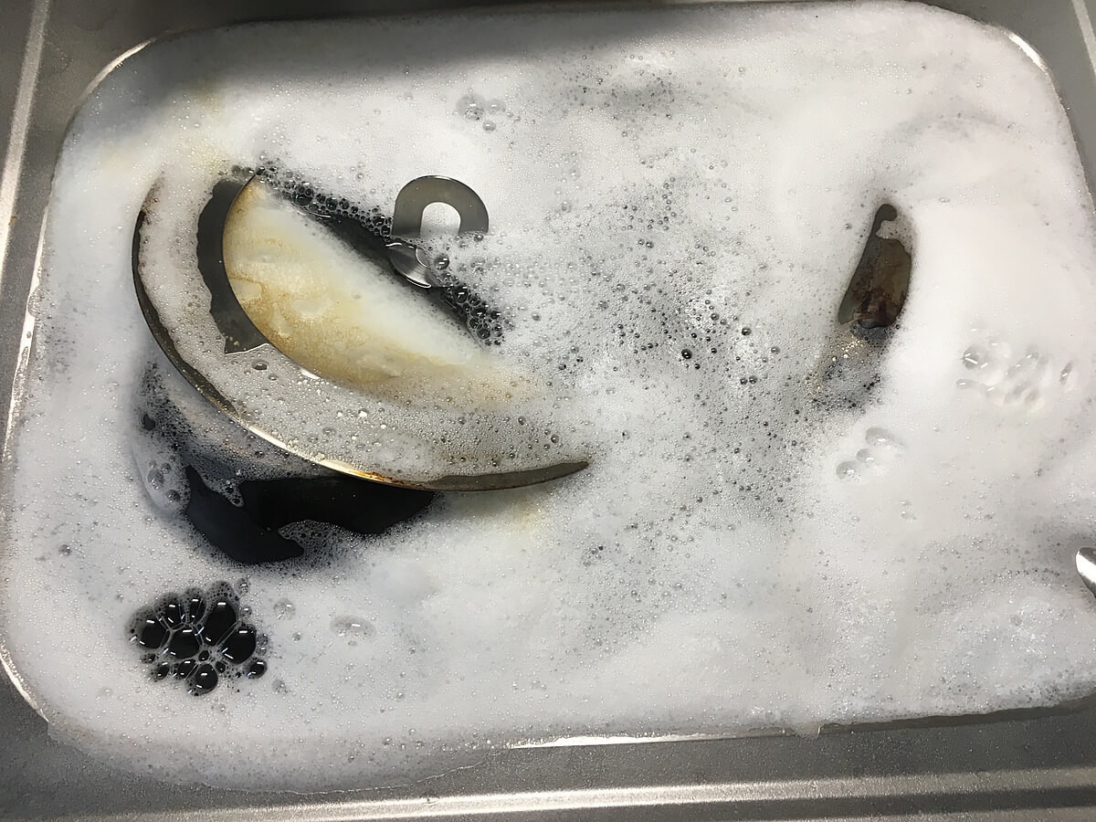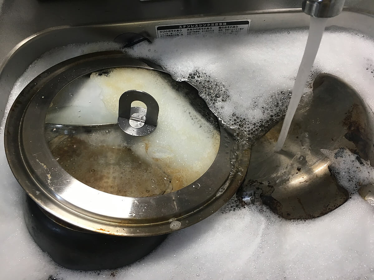 見た感じ少し落ちているようには見えますが、フライパンや蓋にはまだコゲが残っている様子。