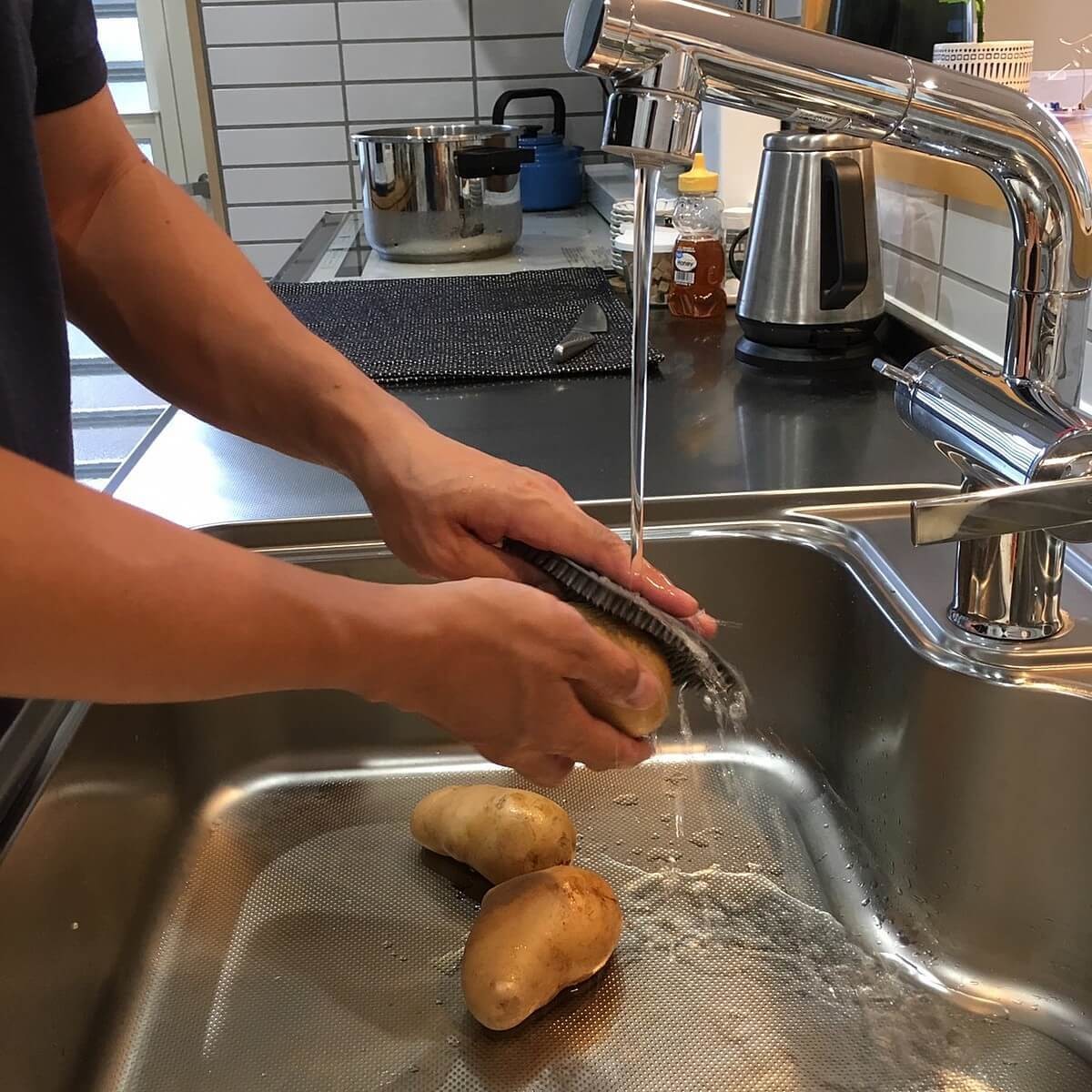 流水で流しながらじゃがいもをブラシで擦ると、あっという間に土が落ちてキレイに。