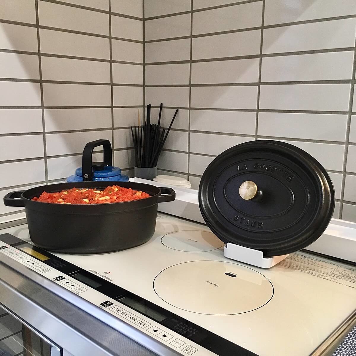 1.8kgあるストウブ鍋のふたも、しっかり安定して置くことができます。 お玉や菜箸の一時置き場所にもなり、スムーズな調理の縁の下の力持ち。