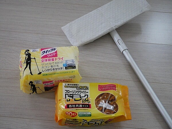 写真のように天井、壁と上から下にかけてクイックルワイパーにドライシートを付けて埃を取っていきます。