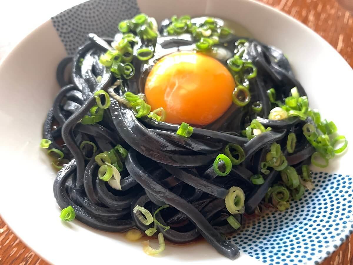 こうしていろいろトッピングして色味を足していくと、真っ黒なうどんも美味しそうに見えてきました。