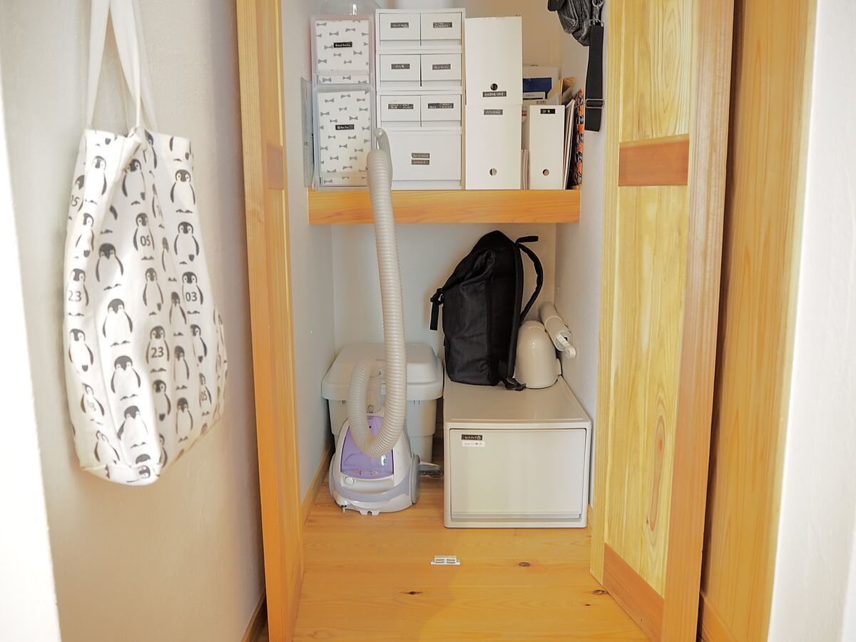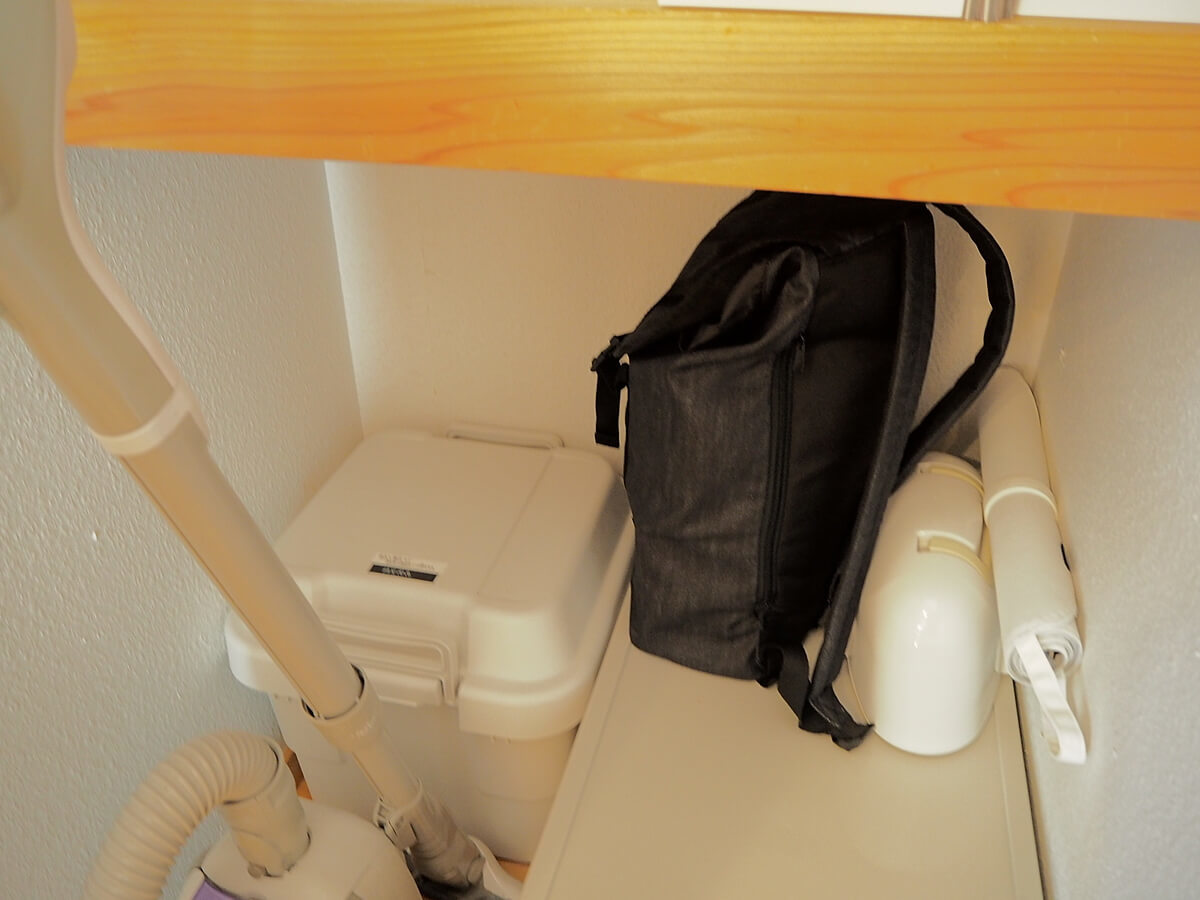 掃除機を収納している場所ということもあり、この扉はほぼ毎日開きます。この奥に入っている黒いリュックと、白いBOXの中身が防災用品です。