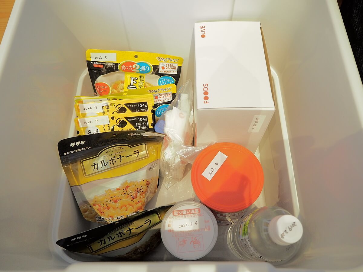 無印良品の頑丈ボックスに非常食をしまいこんでいることもあって、ぱっと見、中身と量が分かりにくい……(汗)。