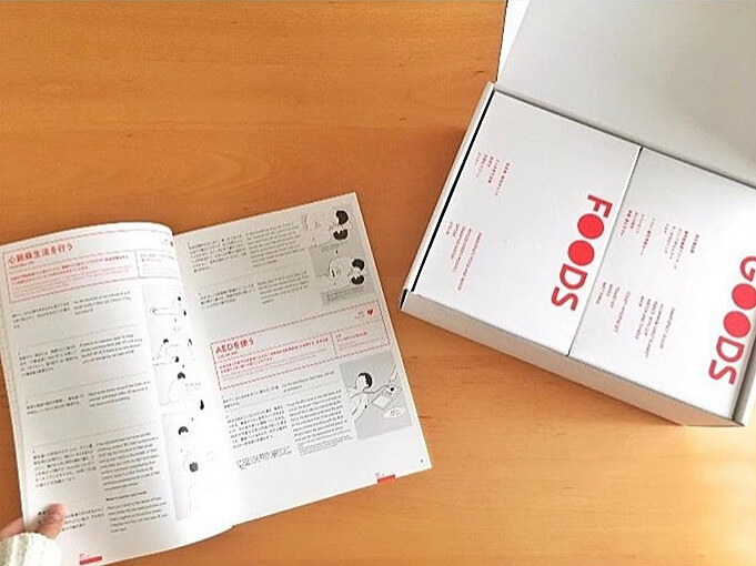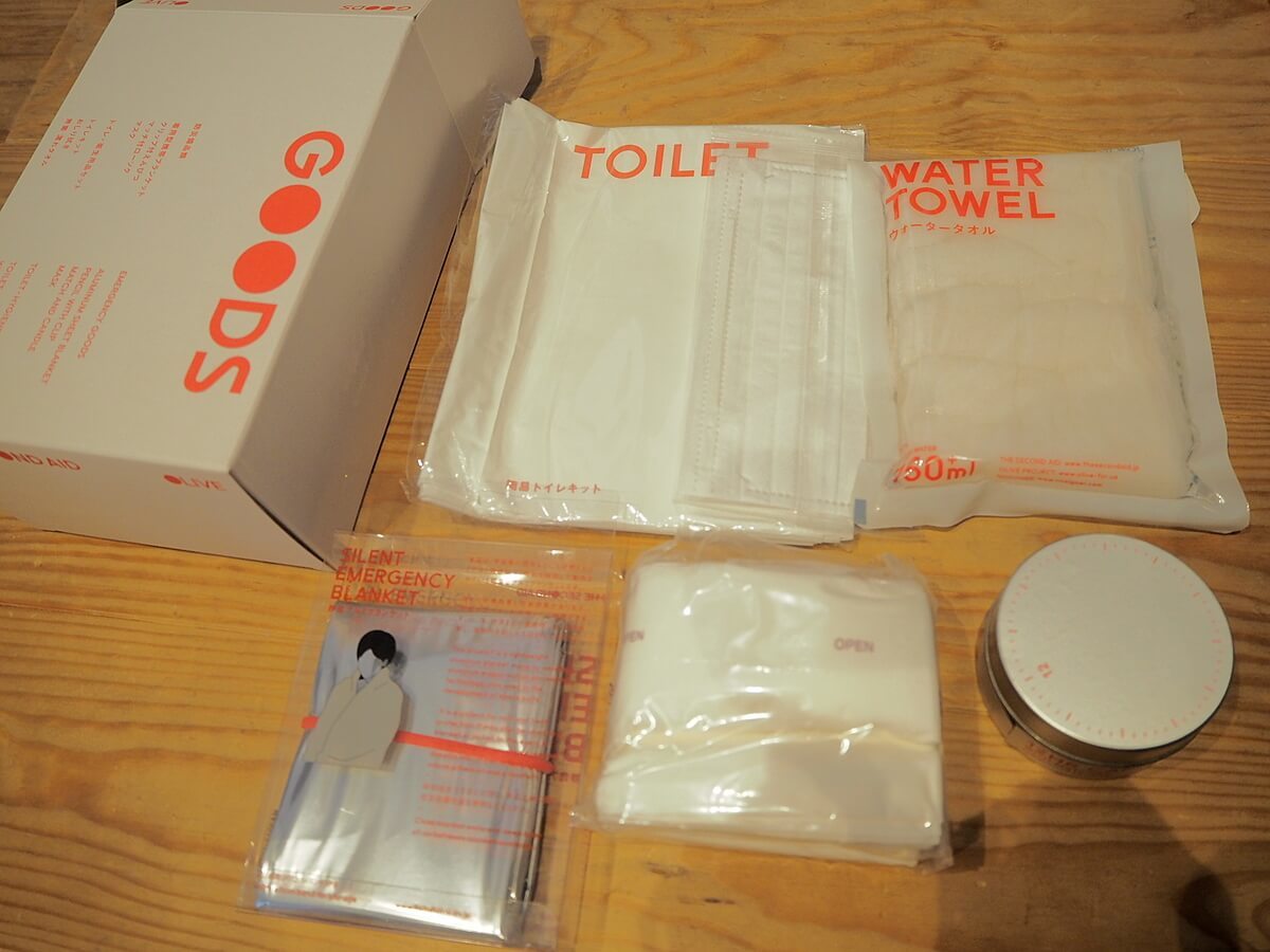 中身は「非常食セット(FOODS)」「防災備品類(GOODS)」「非常時に読む本(BOOK)」の3つが入っています。