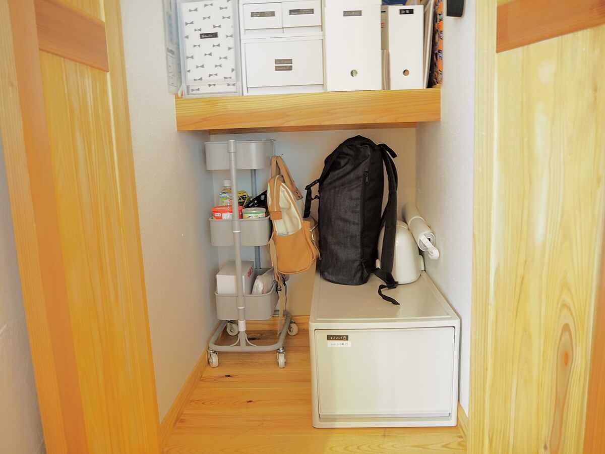 玄関の土間収納に収めていた時期もあったのですが、定期的に開け閉めするこちらに収納しておく方が、点検のハードルが下がるようにも感じたので……。
