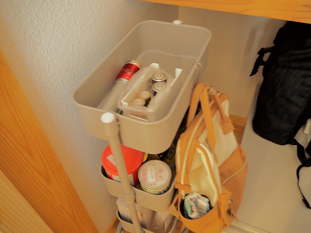 我が家の防災グッズは、リビングの階段下にあたる収納棚にしまっています。