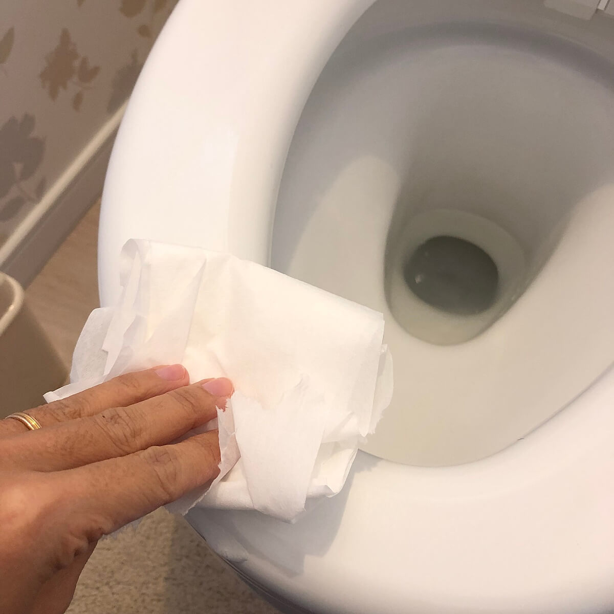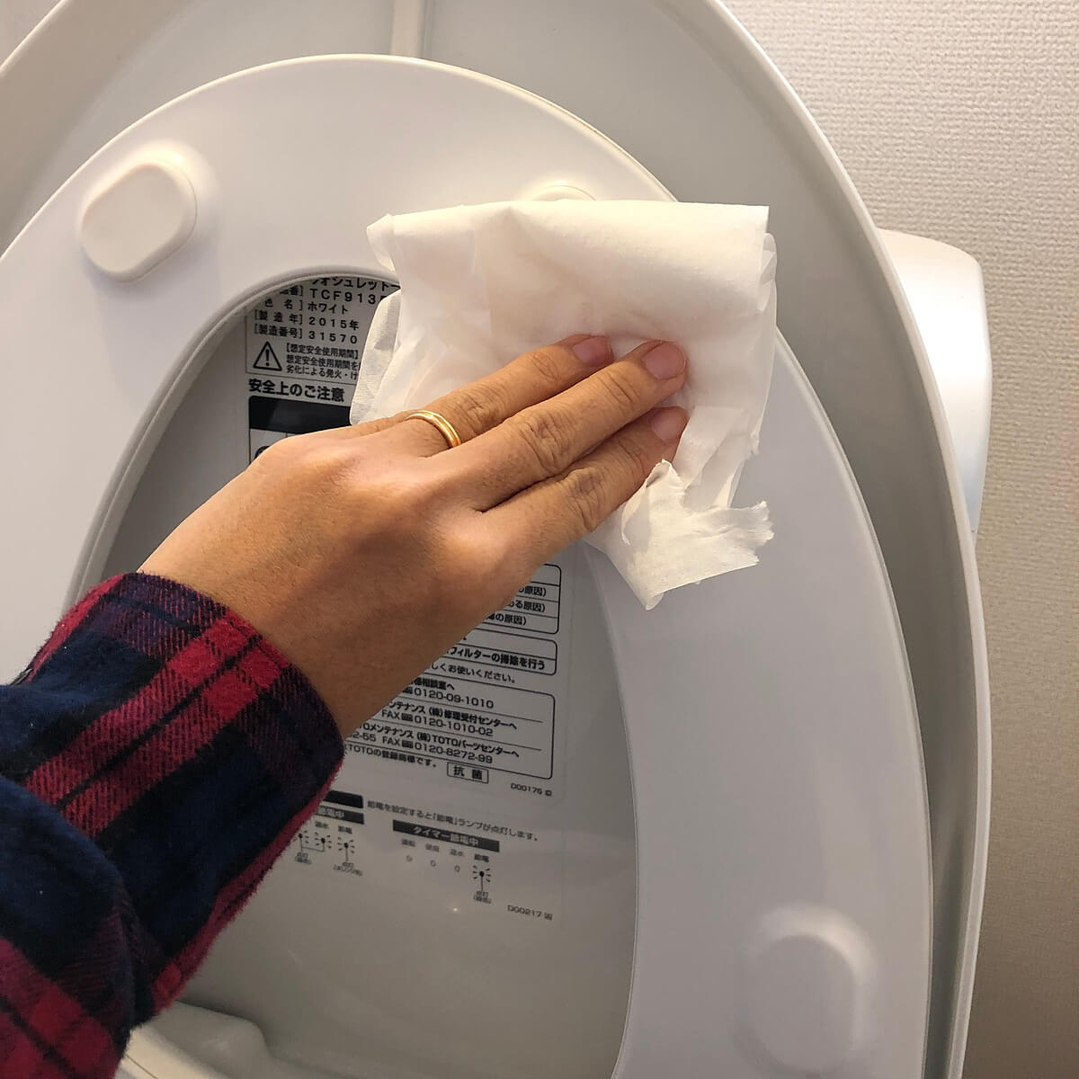 そのまま、手に持ったペーパーを使って便座を上げ、便座裏や便器の淵まで拭きあげます。