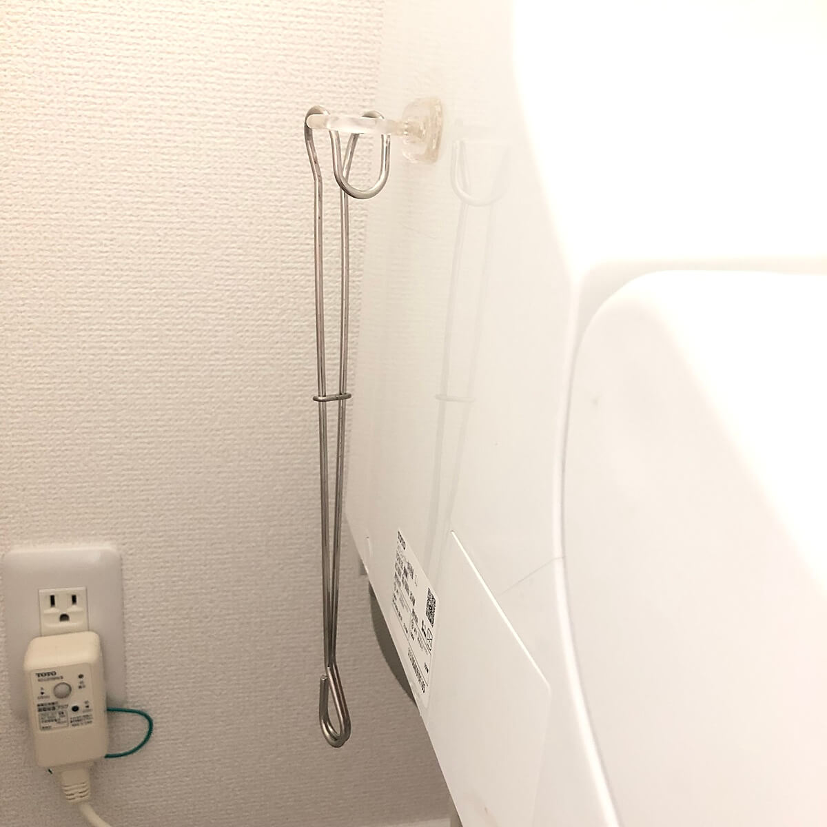 掃除のあとはトイレブラシは流して、スポンジトングをまめピカで拭き取り、引っかけ収納しています。